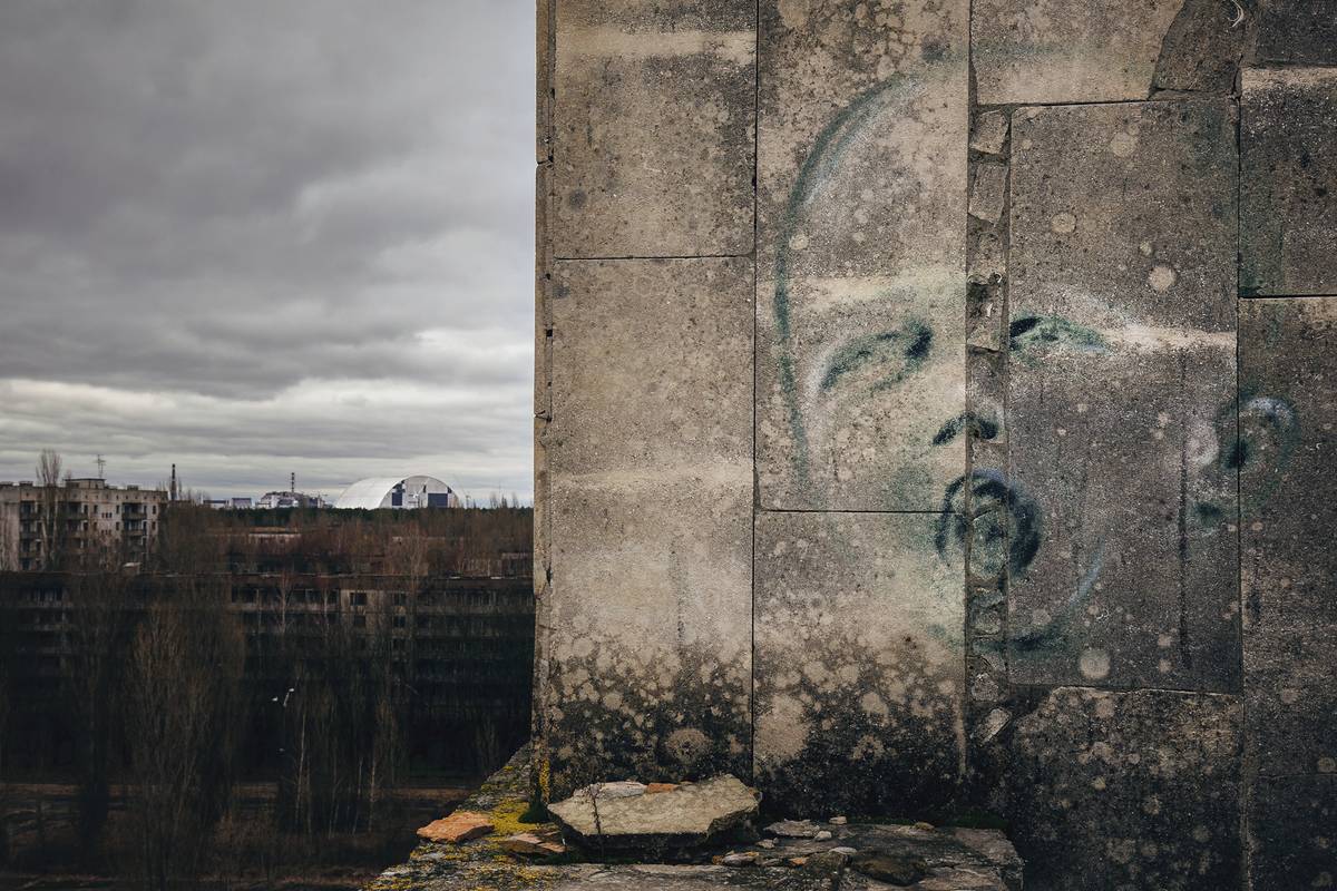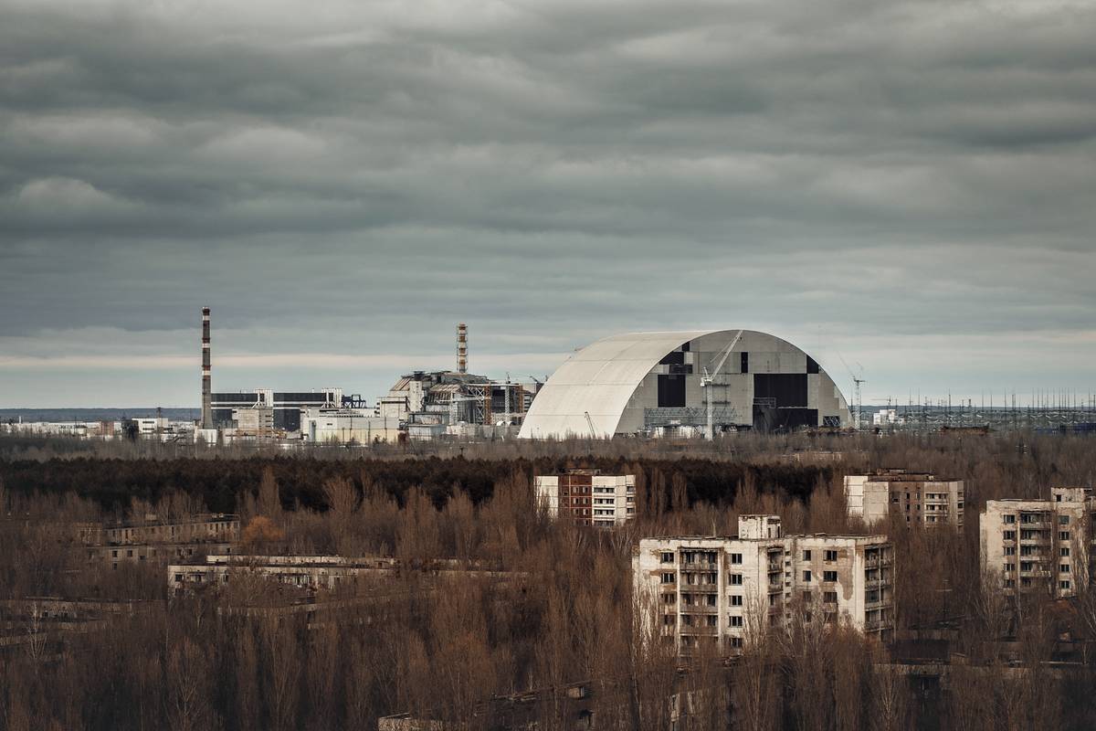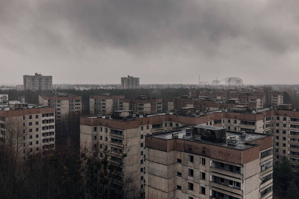 Unikátní pohled z jedné ze střech vysokých pripjaťských budov. Nový kryt Černobylské jaderné elektrárny teprve vznikal vedle budovy 4. reaktoru a následně, několik měsíců po mé návštěvě, na něj byl nasunut.