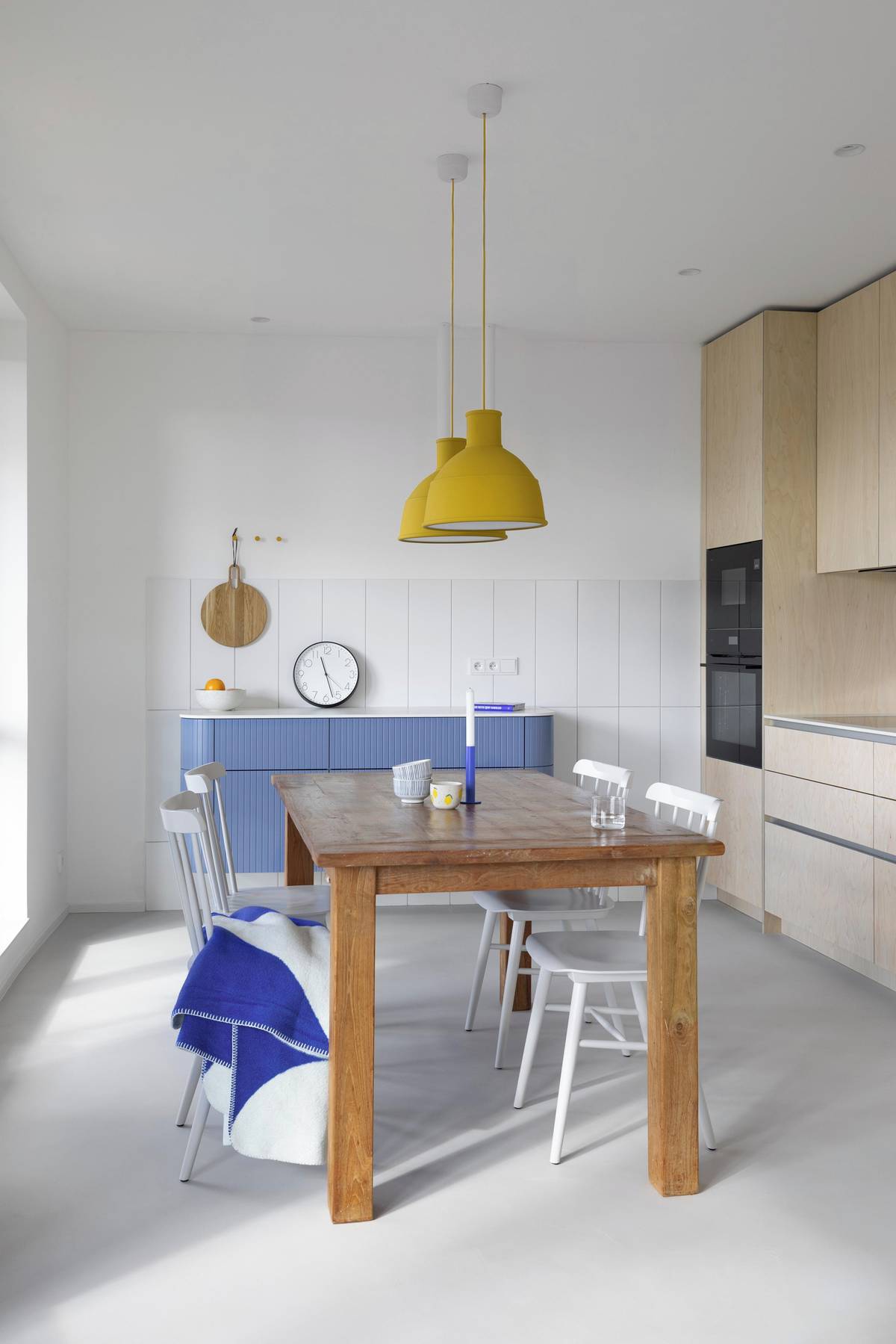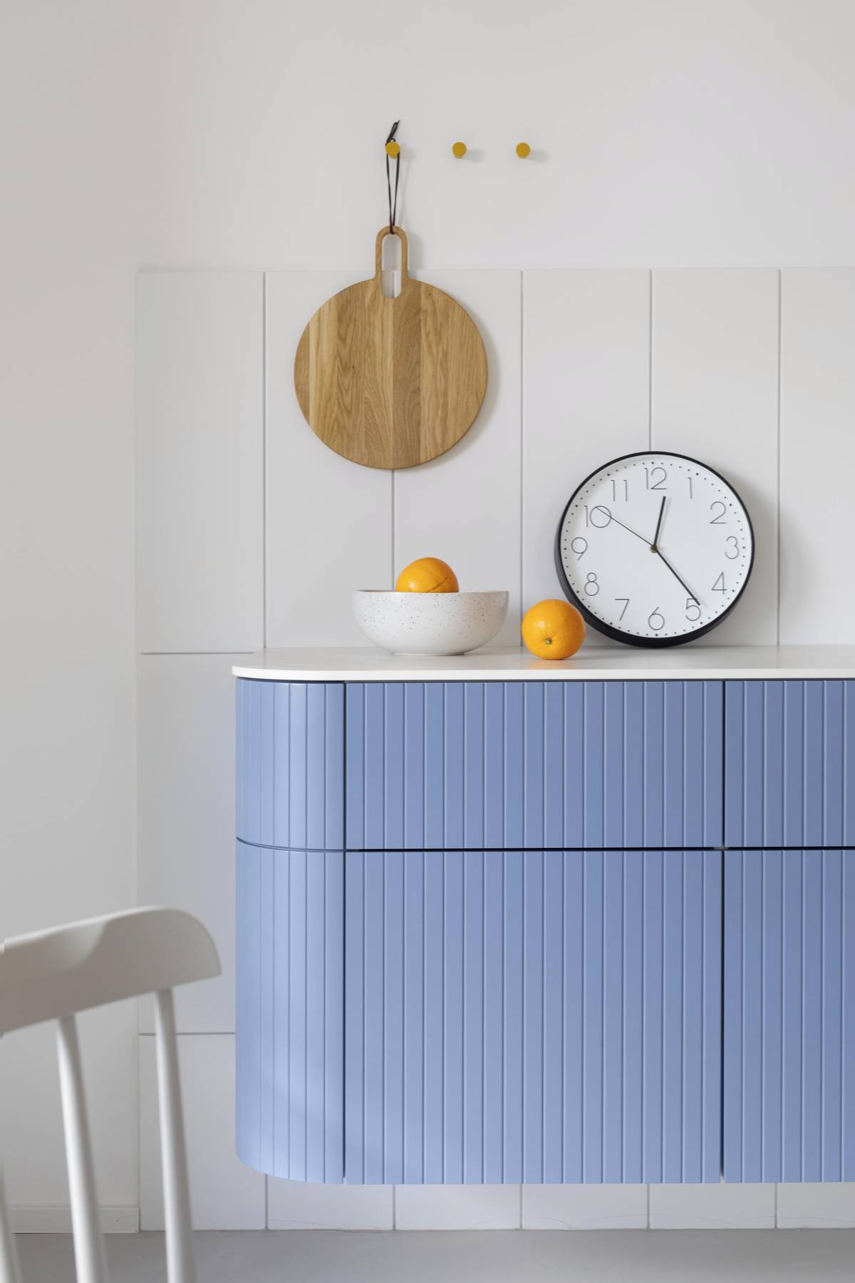 Oblá rastrovaná modrá komoda je dominantním prvkem jídelního koutu.
