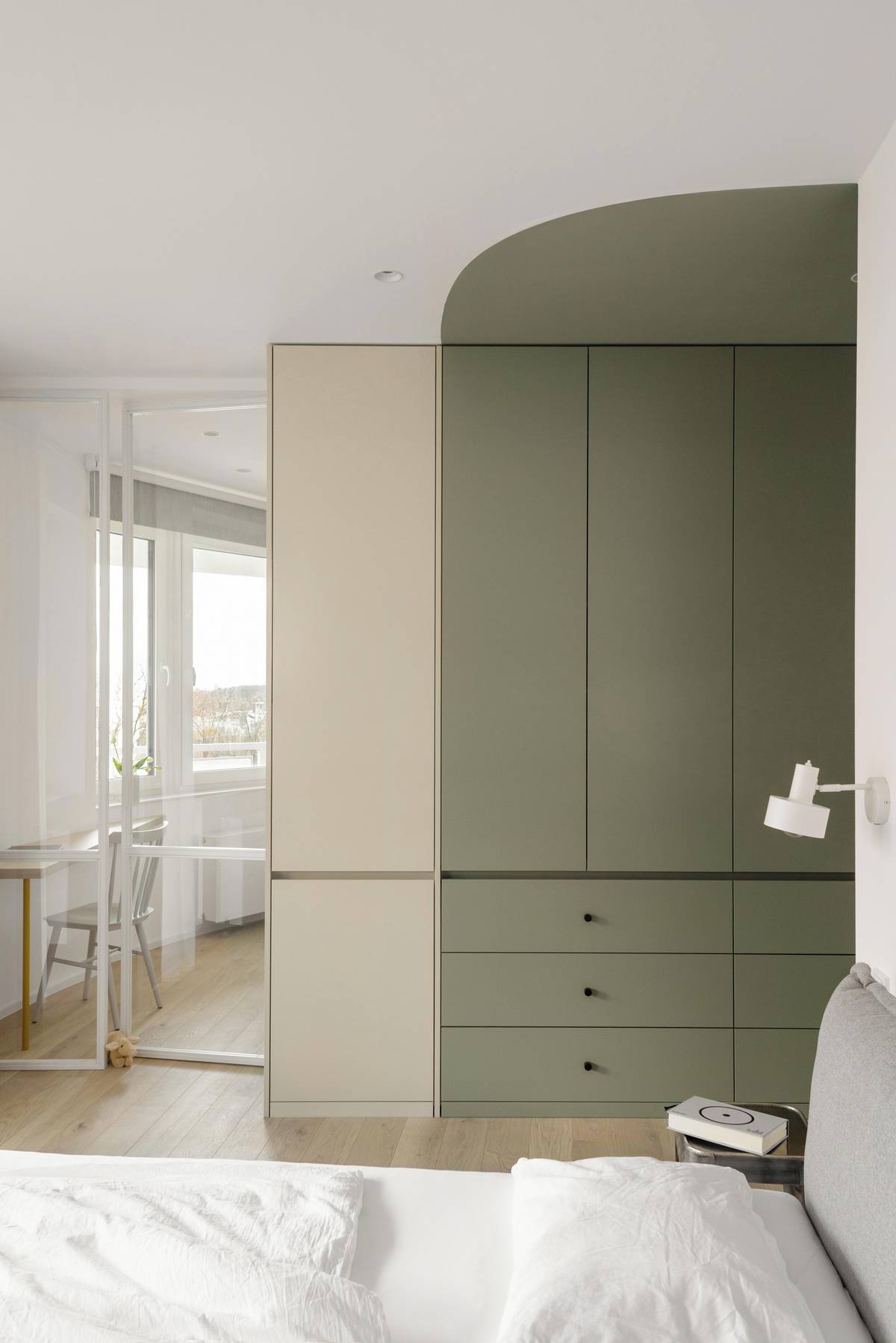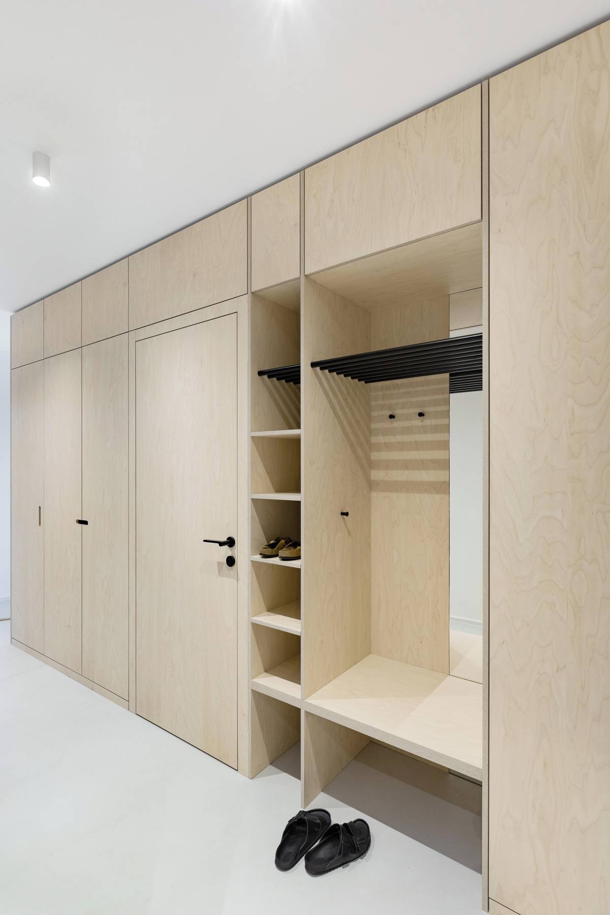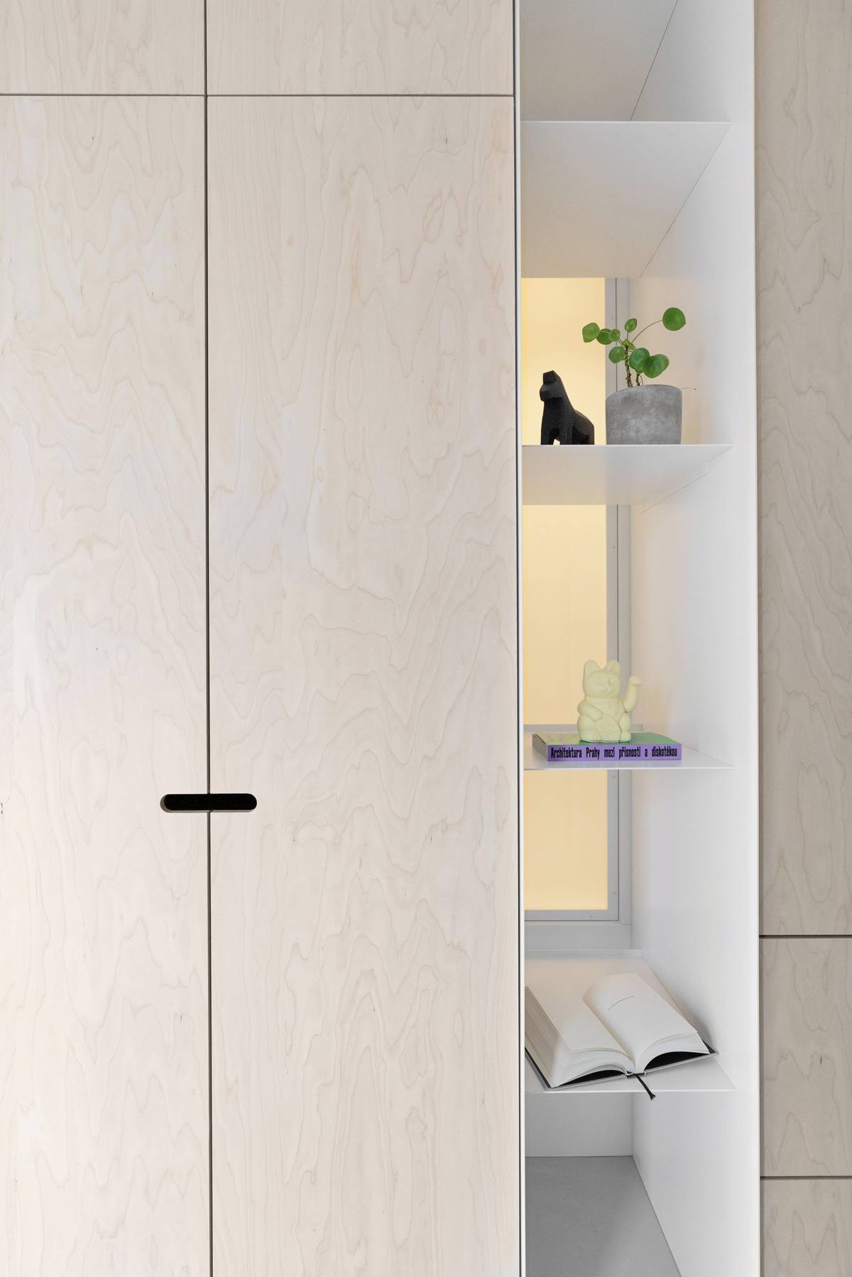 Interiér si pohrává nejen s barvami, ale i materiálem. Vůdčí je bělená překližka.