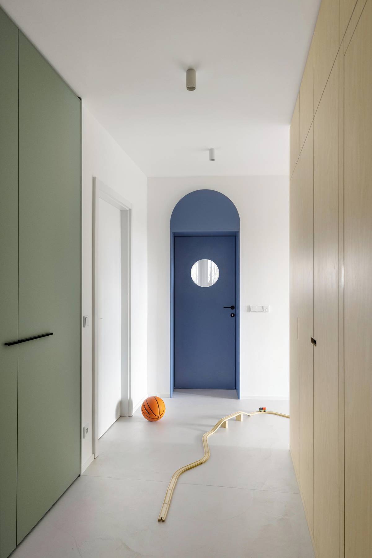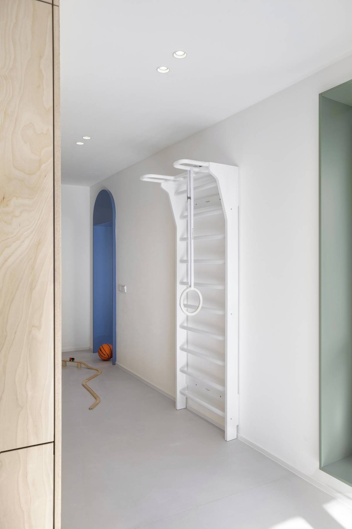 Žebřiny v chodbě v bílém decentním odstínu se staly oblíbeným solitérem aktivních členů rodiny.