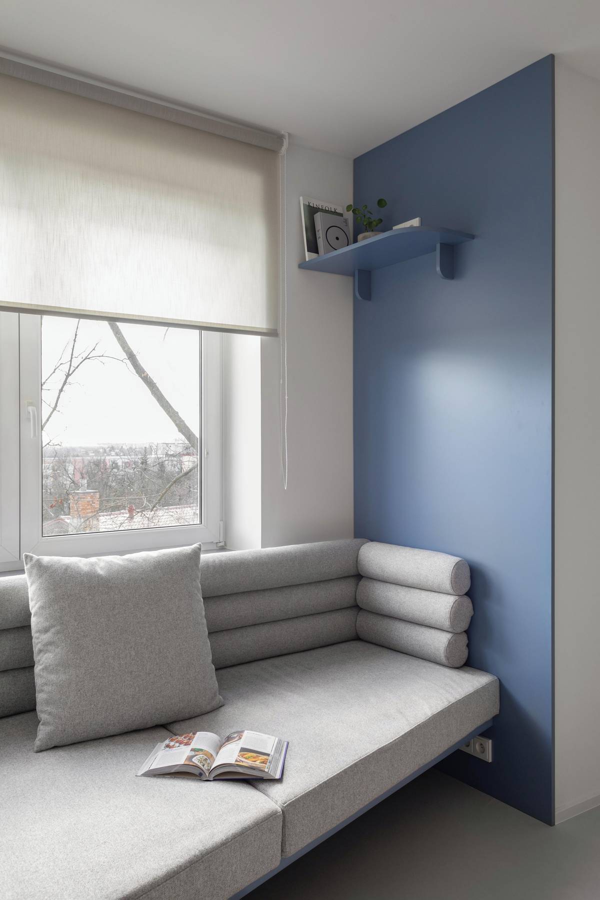 Velkorysé čalouněné sezení pod oknem je navržené na míru.
