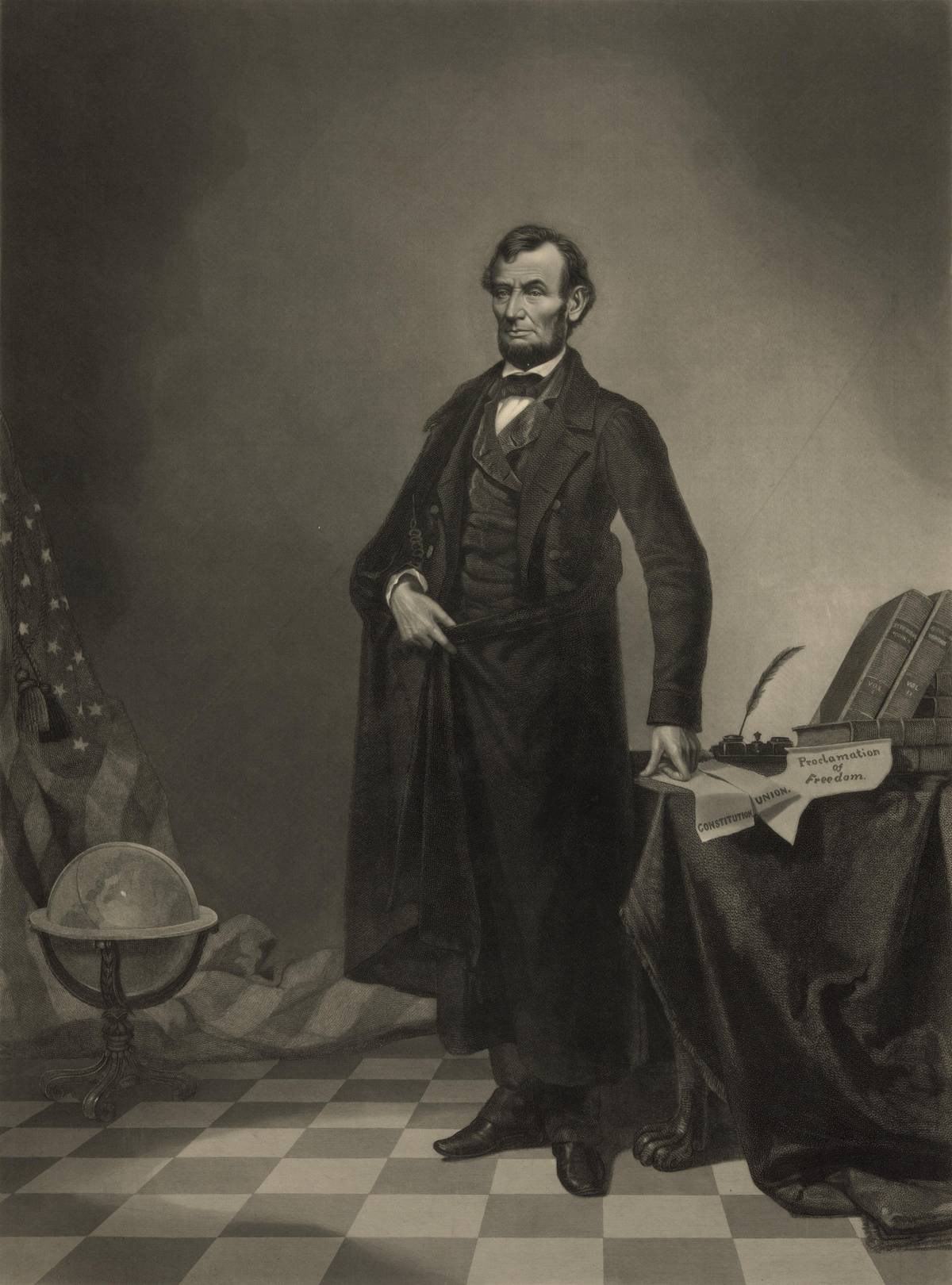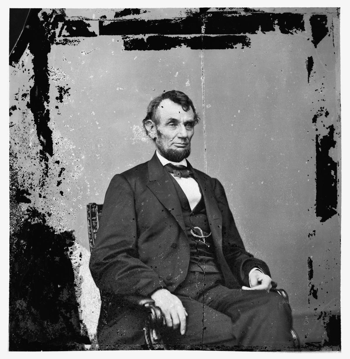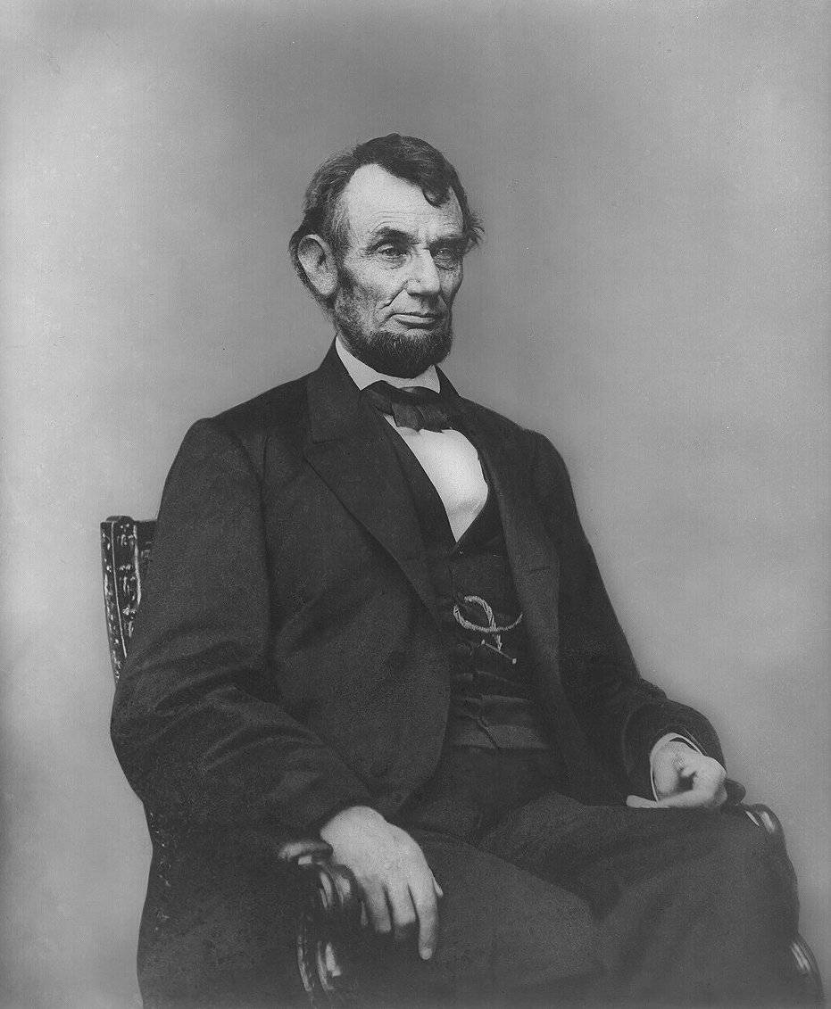 Bergerovo foto Abrahama Lincolna z roku 1864, z nějž autor použil hlavu na fotomontáž. Vyretušovaný snímek.
