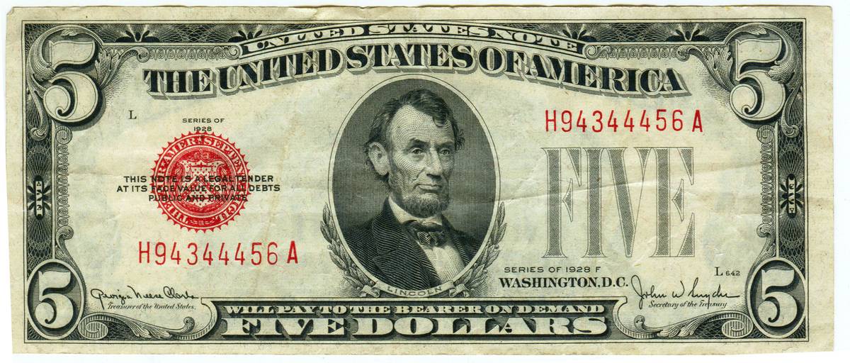 Stejný portrét Lincolna posloužil i při návrhu starších verzí pětidolarových bankovek. Verze z roku 1928.