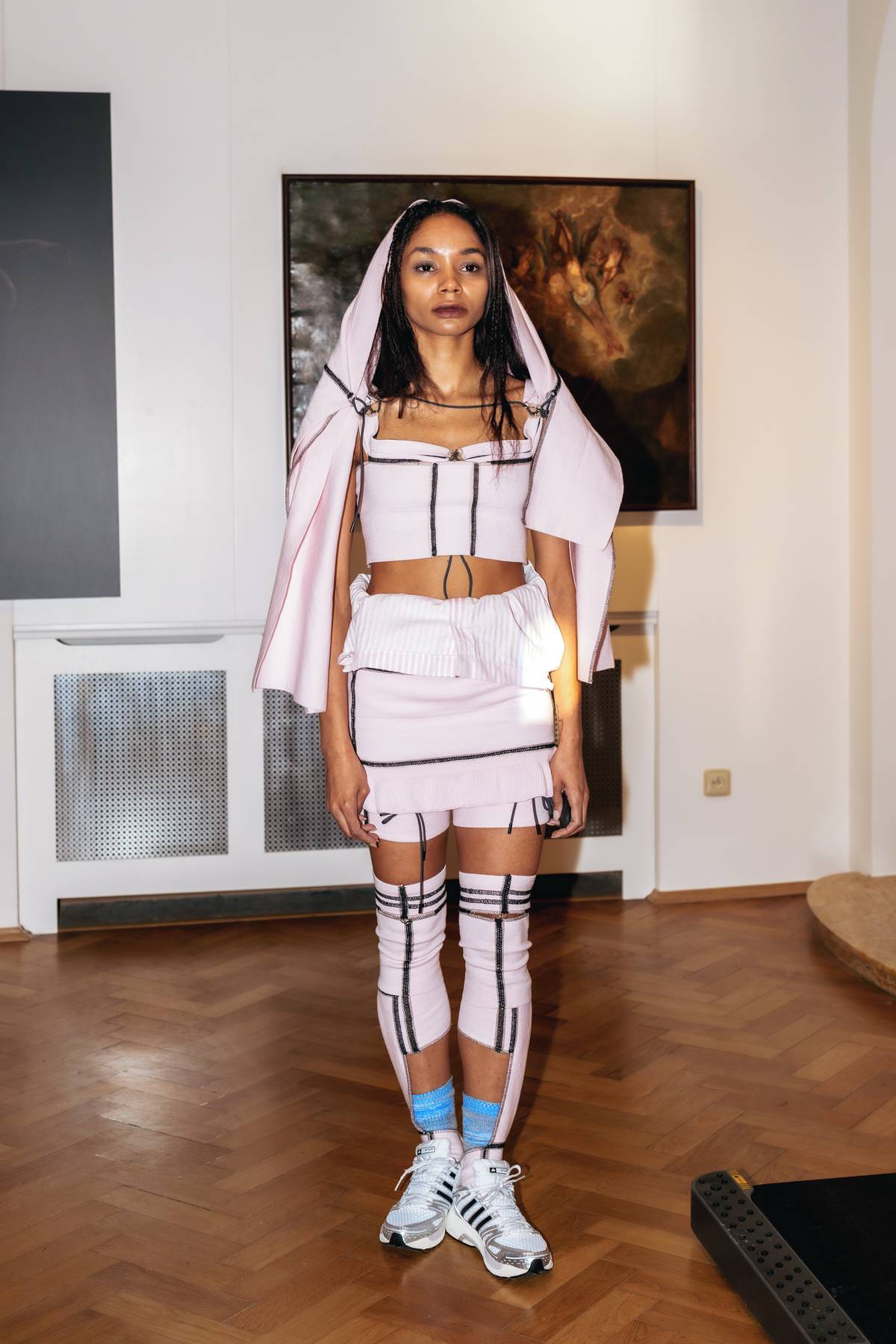 Návrhářka Valérie Jurčíková a její kolekce 5.0 inspirovaná 90. léty. Náplety na nohou odkazují ke klasickému aerobiku, který byl oblíbený také na VHS kazetách.