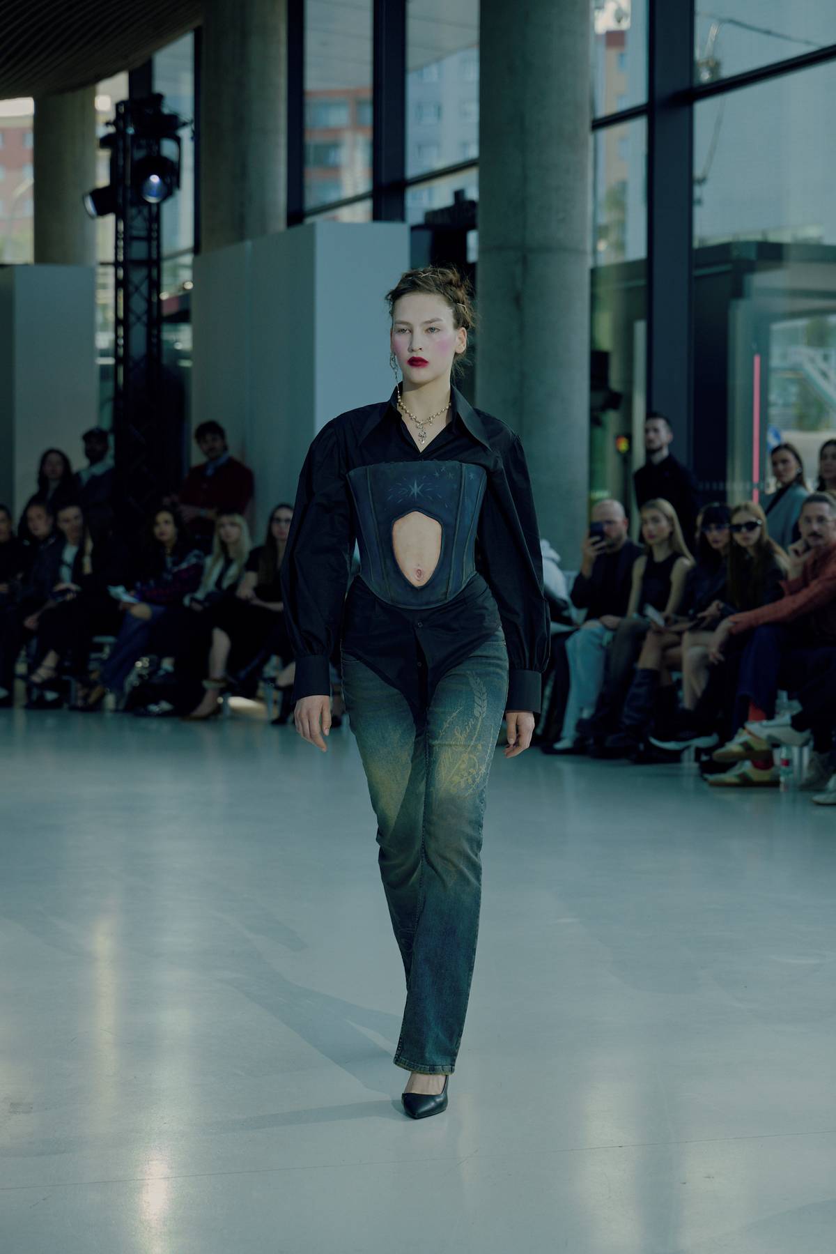 Denimový model návrháře Tobiase Schuberta, který není na pražském fashion weeku už žádným nováčkem.