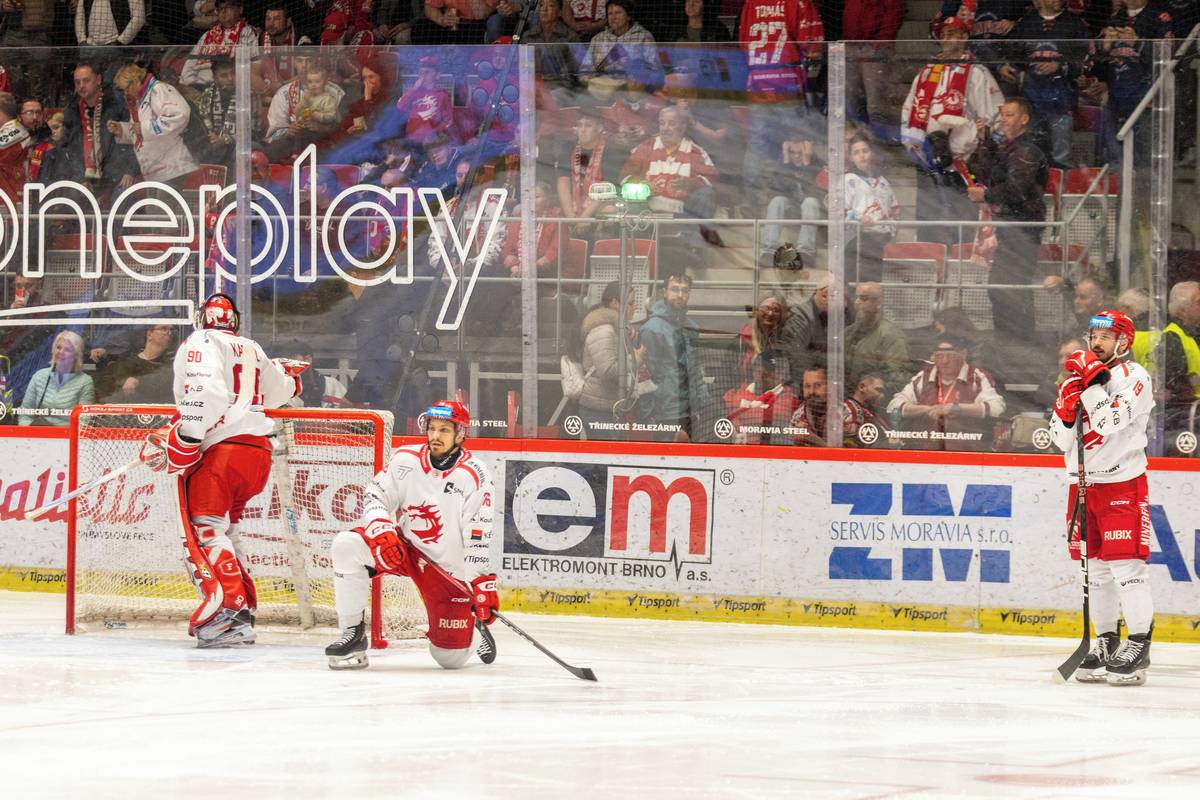 Smutek Třince, zleva brankář Ondřej Kacetl, Jakub Galvas a Patrik Hrehorčák z Třince.