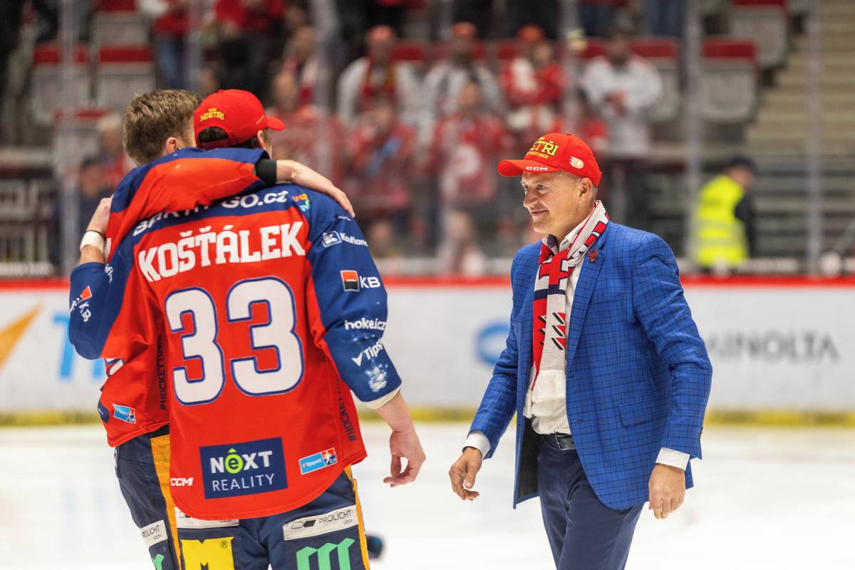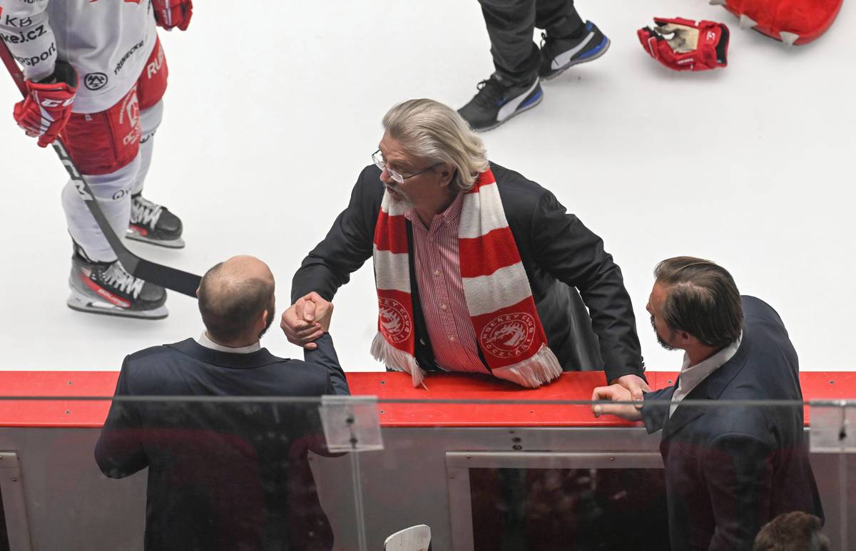 Uprostřed prezident klubu HC Oceláři Třinec Ján Moder se zdraví s trenéry po šestém finálovém duelu.
