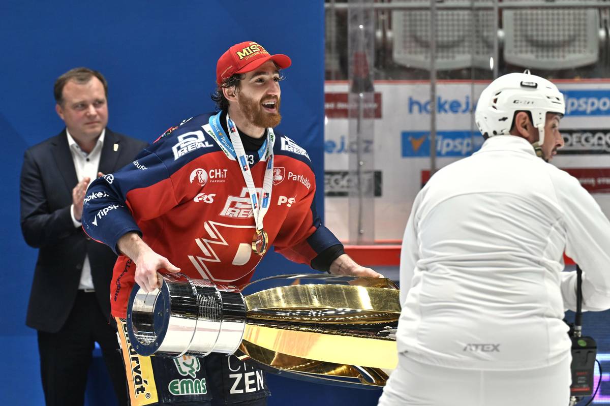 Roman Červenka z Pardubic s pohárem pro mistry extraligy.
