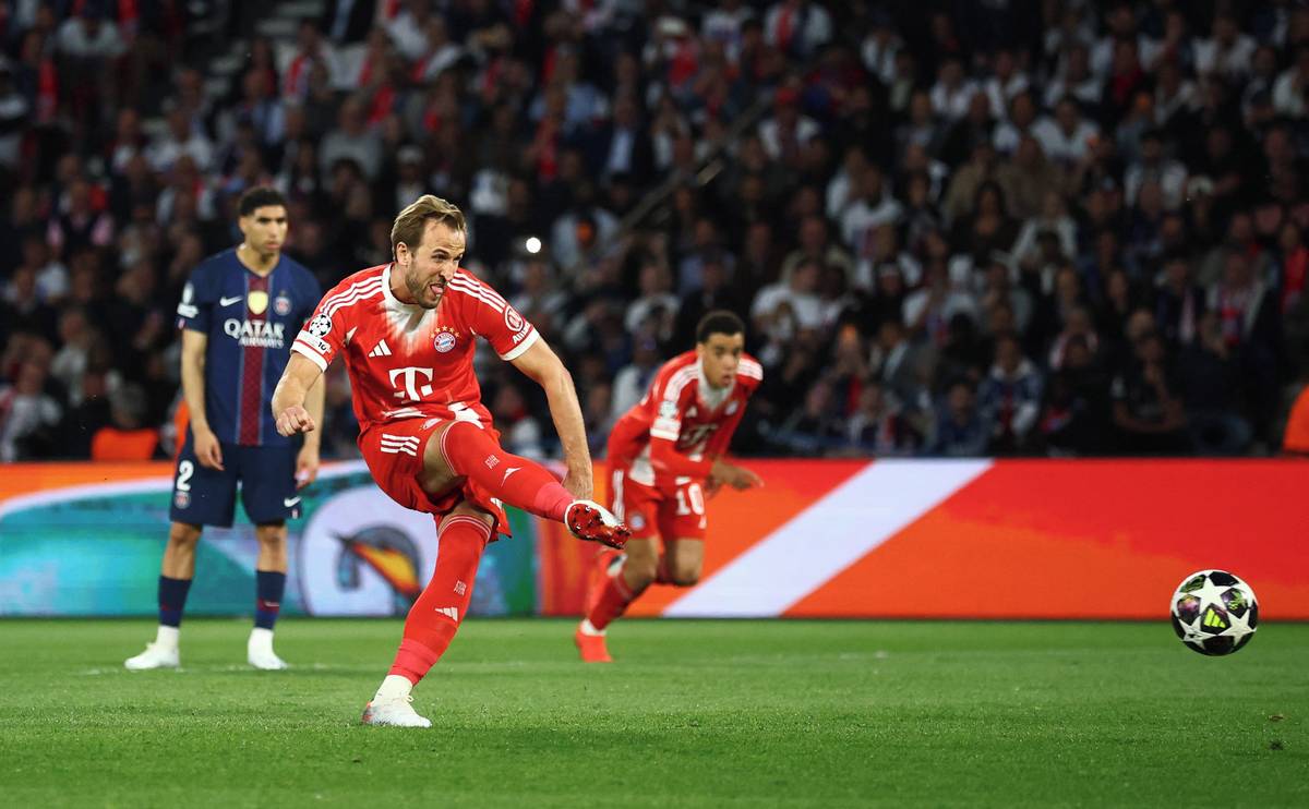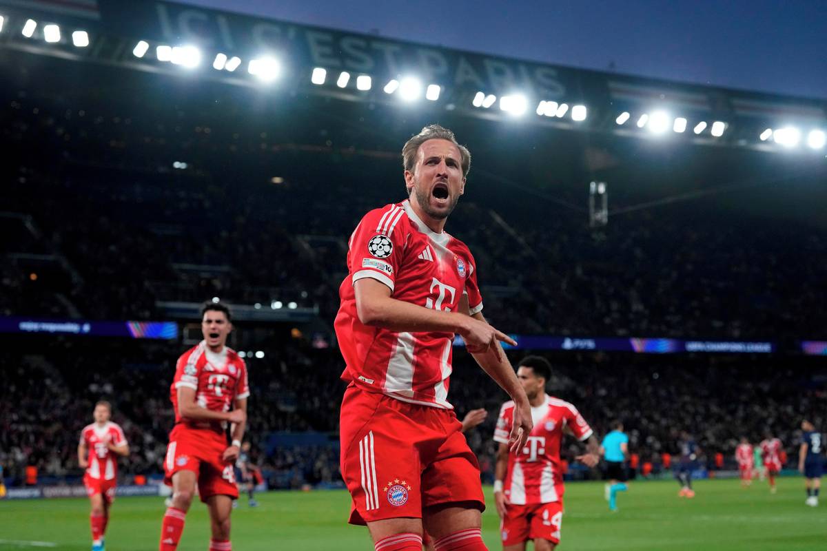 Kanonýr Bayernu Harry Kane oslavuje trefu z penalty proti PSG.