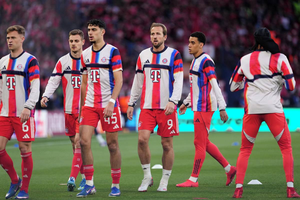 Harry Kane (uprostřed) se spoluhráči z Bayernu během úvodního semifinále Ligy mistrů.