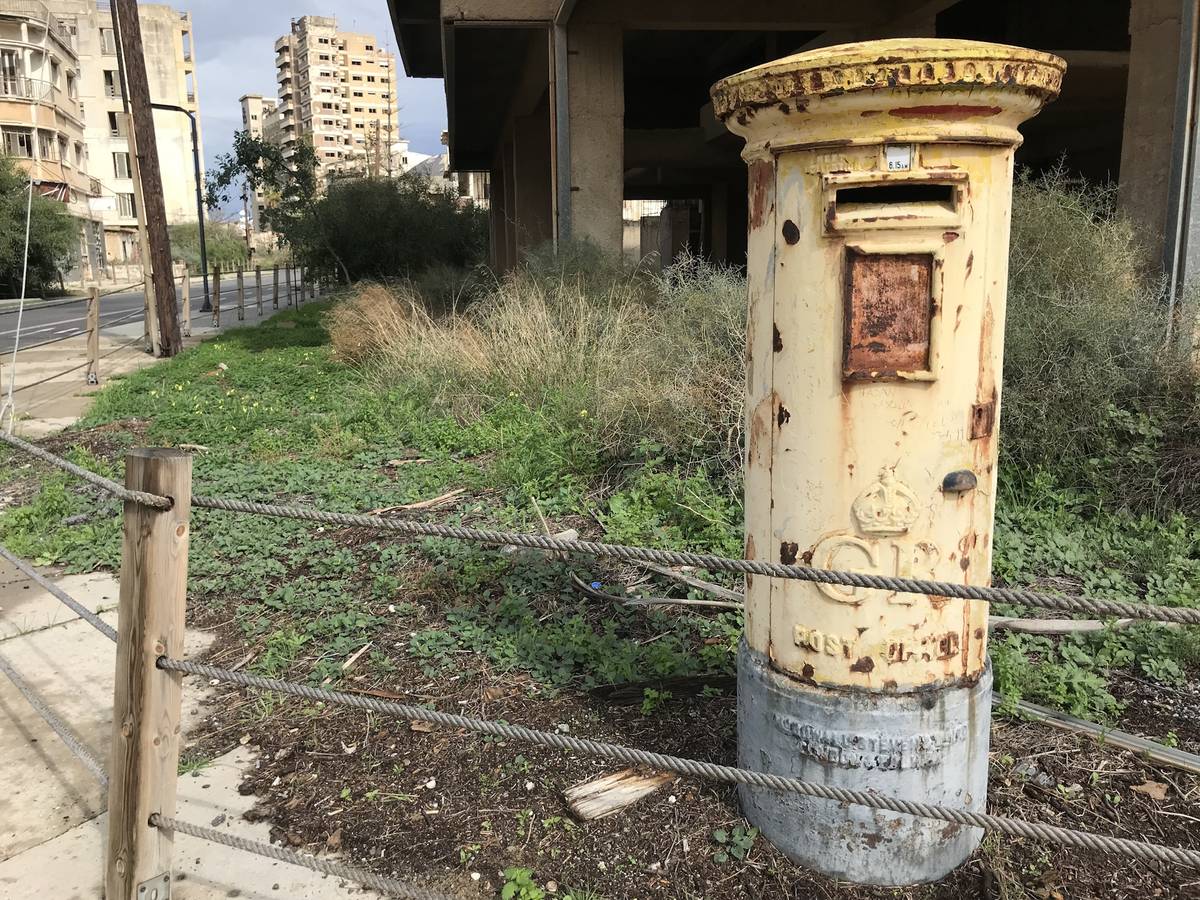 „Některé pozemky patří dokonce Britům, kteří měli Varošu jako kolonii až do roku 1960,“ říká taxikář Mikail Tumurlenk, který mě dovezl z Nikósie (hlavní město Kypru) na prohlídku Varoši. Na obrázku je poštovní schránka s iniciály GR (George Royal) odkazující na vládu britského krále Jiřího.