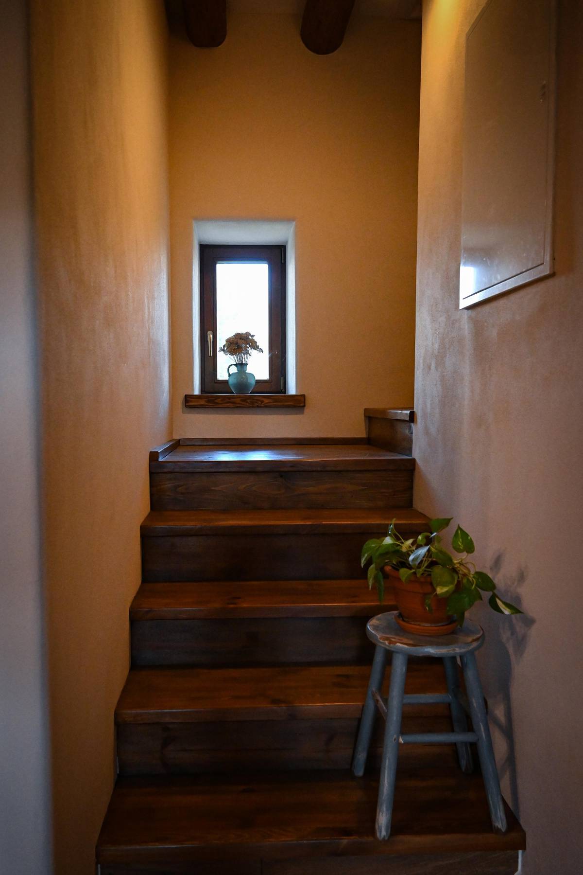 Dům je dvoupodlažní, do patra vede dřevěné schodiště