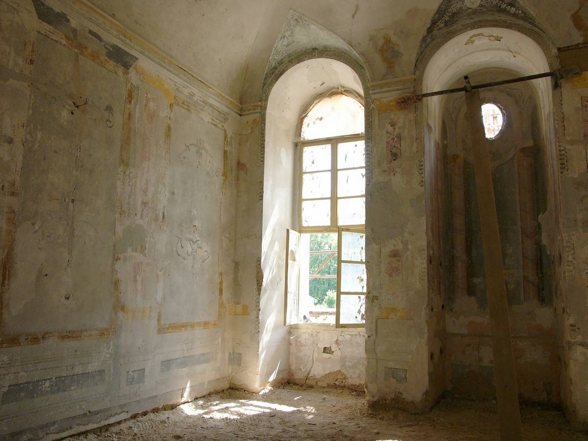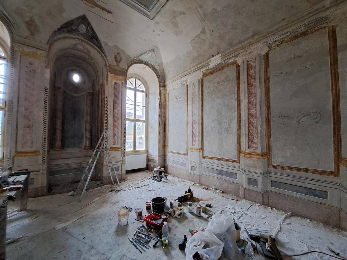 Na zdech na chodbách lze vidět zatím nezrestaurované fresky.