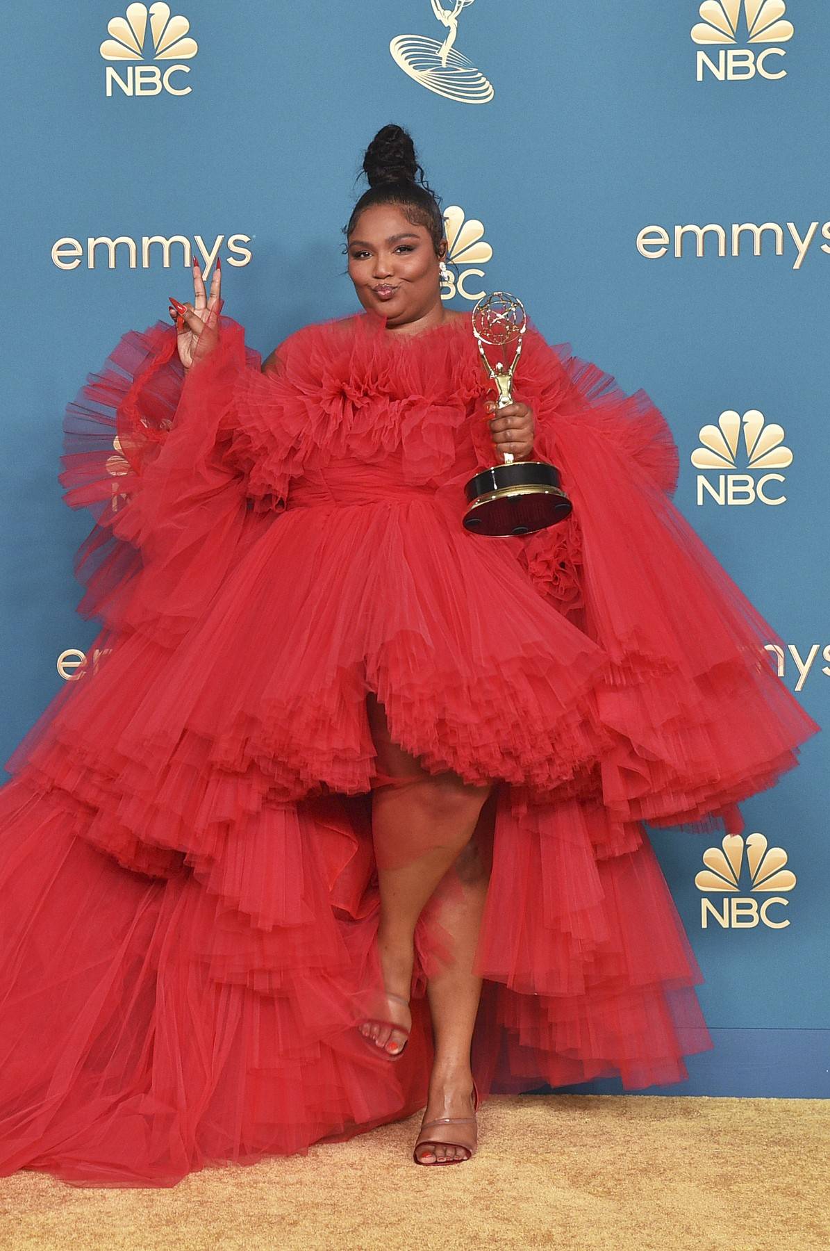 A další zábavný tyl. Nepřehlédnutelné červené šaty si Lizzo oblékla na předávání cen Emmy a ano, jde o populární model od Giambattisti Valliho