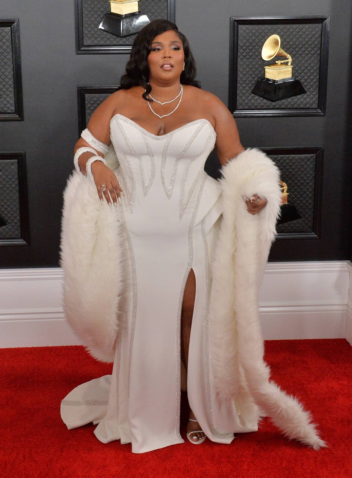 Během večera vystřídala rovnou dvoje šaty. Od značky Versace měla ušité i bílé korzetové šaty s kamínky