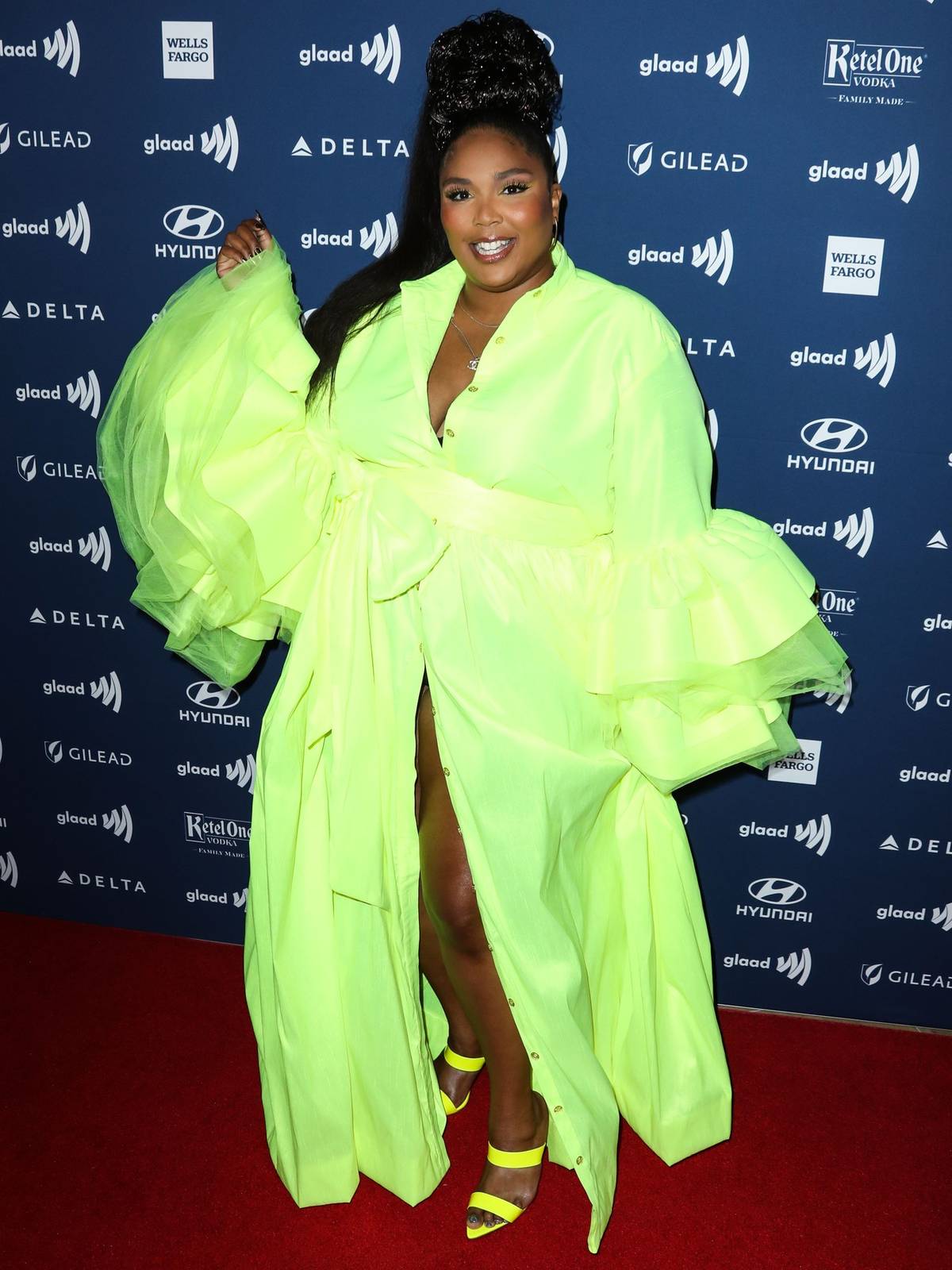 Výrazné barvy zpěvačce sluší. Neonové košilové šaty pro ni ušil návrhář Christopher John Rogers