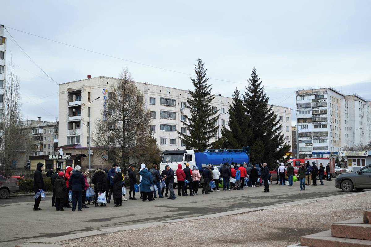 Fronta na pitnou vodu v povodněmi zasaženém městě Petropavl na severu Kazachstánu poblíž hranic s Ruskem, 14. dubna.