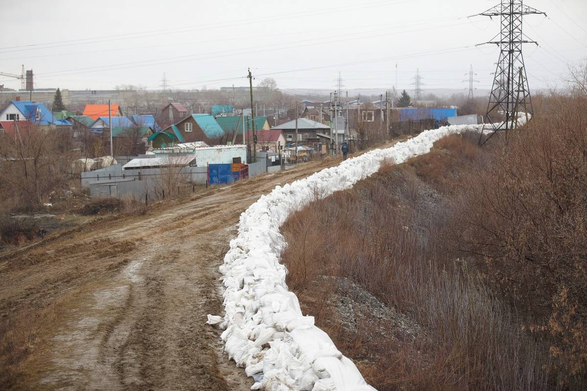 Provizorní povodňová hráz z pytlů hlíny a písku v Kurganské oblasti, 14. dubna.