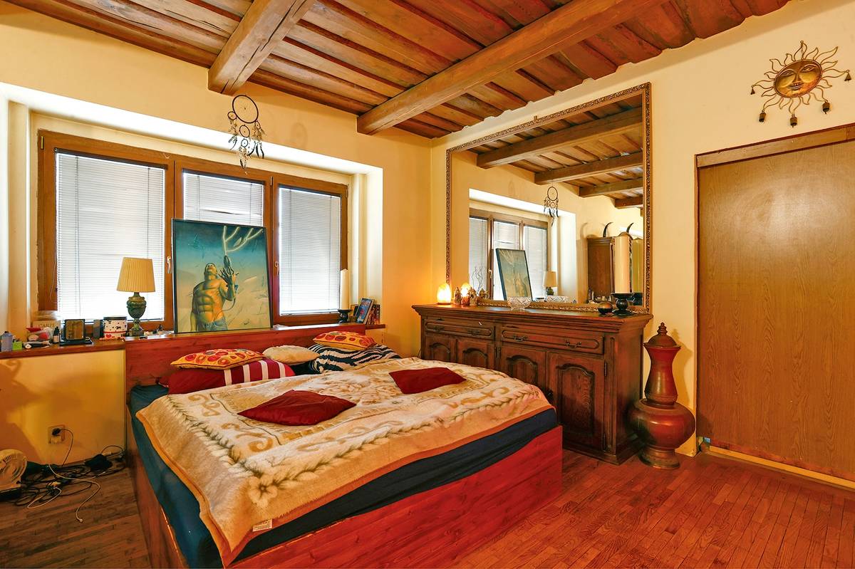 Ložnice je součástí obývacího pokoje a zrcadlo ještě umocňuje dojem z velkého prostoru. Na parapetu je jeden z obrazů Martina Maxy