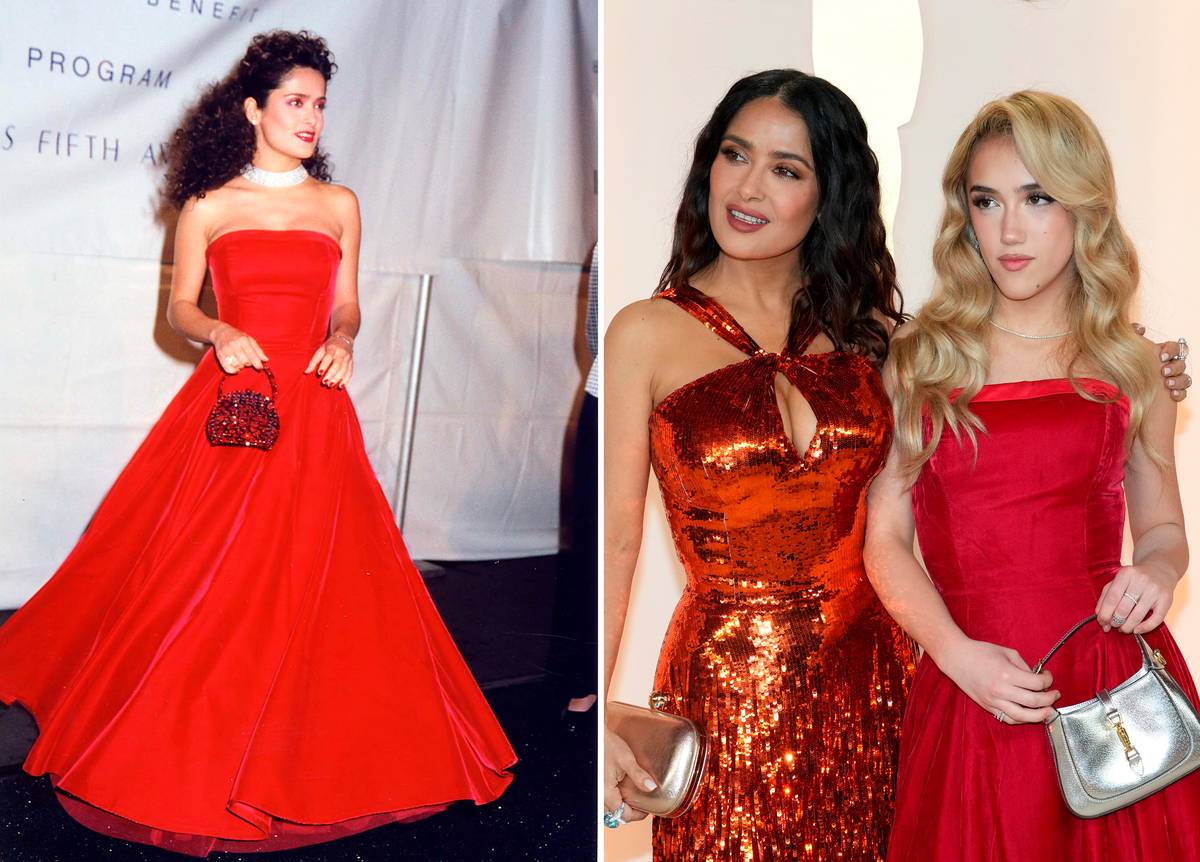 Salma Hayek v šatech Isaac Mizrahi v roce 1997. Stejné oblékla její dcera Valentina Paloma Pinault na loňské Oscary