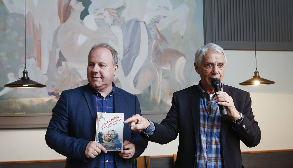 Zpěvák a herec Josef Laufer pokřtil 22. května 2019 svou třetí knihu Pro srandu králíkům a další povídky. Na snímku vlevo moderátor Martin Hrdinka