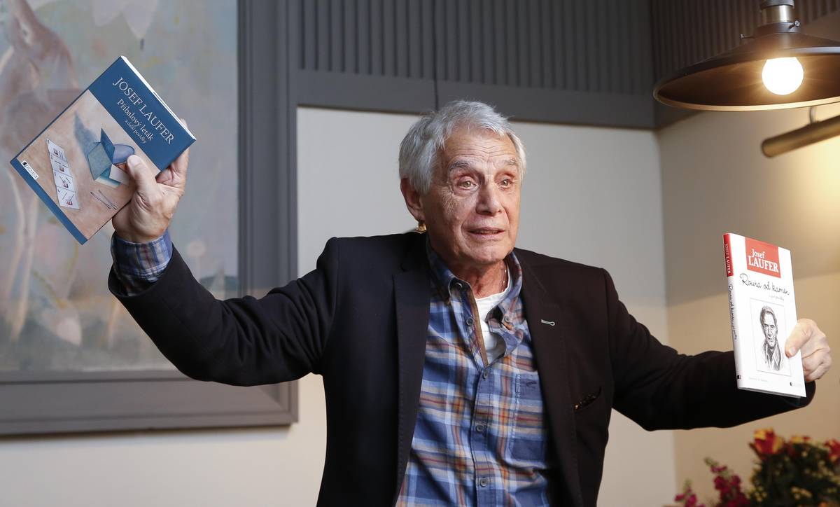 Zpěvák a herec Josef Laufer pokřtil 22. května 2019 svou třetí knihu Pro srandu králíkům a další povídky. Na snímku se dvěma předchozími knihami