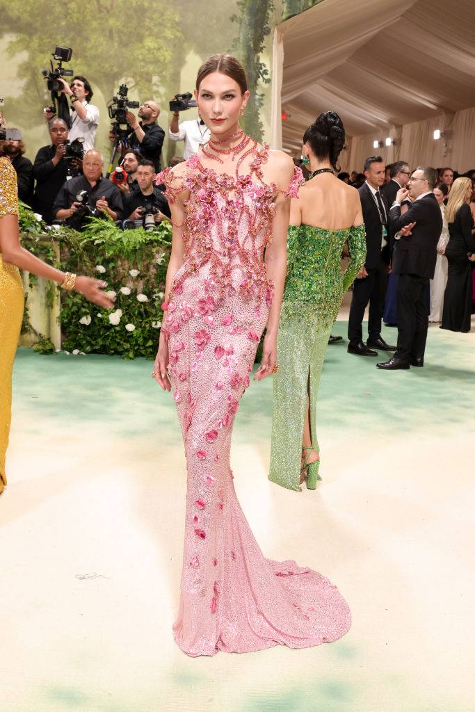 Karlie Kloss. Krásnou barvu šatů si vybrala modelka, jejíž šaty vyrobila značka Swarovski. Kamínky byly doslova poseté
