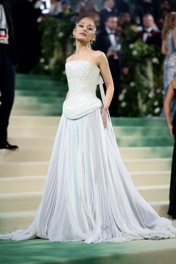 Ariana Grande. Zpěvačka se držela překvapivě při zemi a vybrala si střízlivé, ale překrásné šaty s korzetem od značky Loewe
