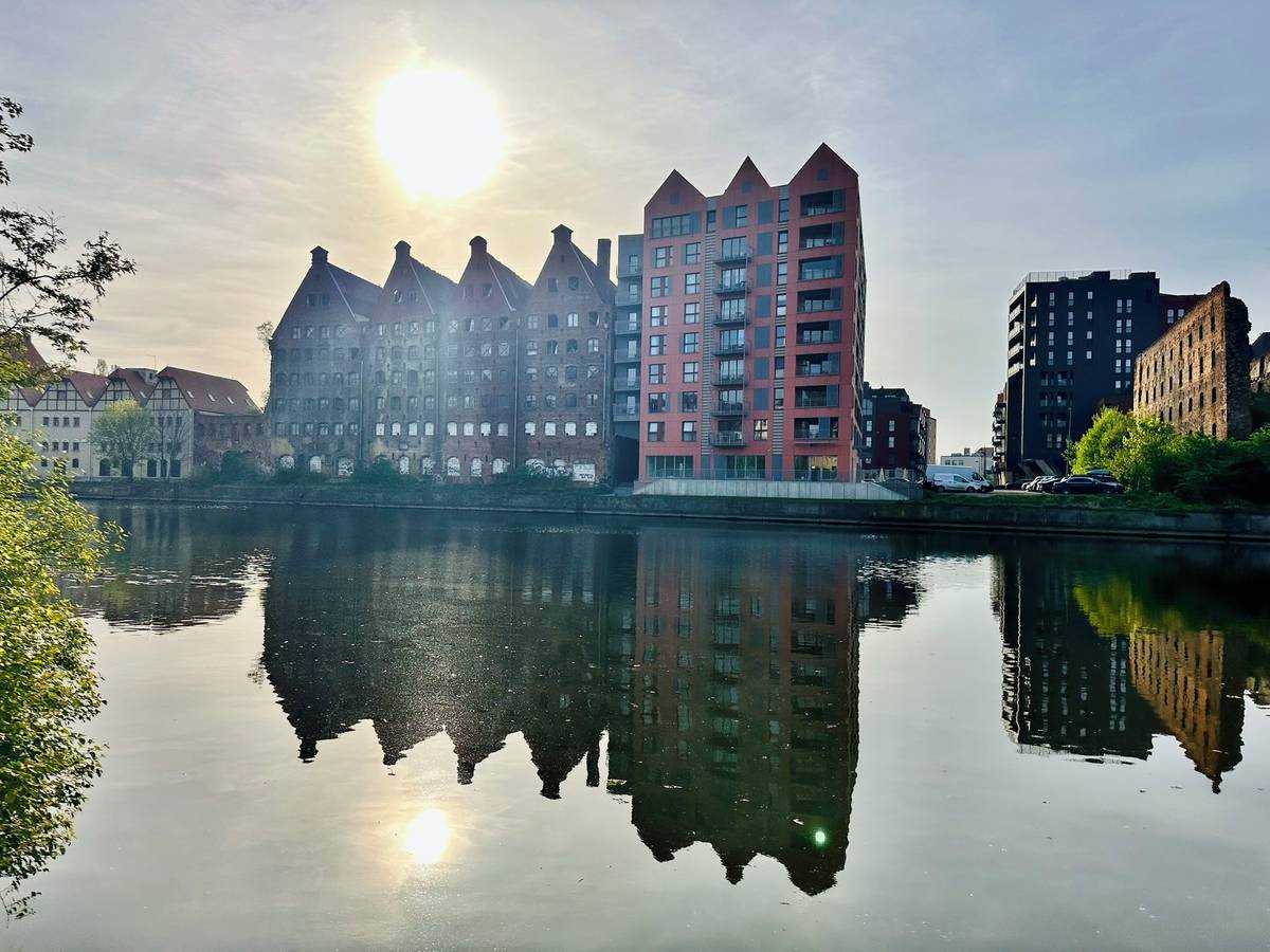 Nábřeží Motławy z Ostrova Špejcharů, který je ohraničen kanálem Nowa Motława.