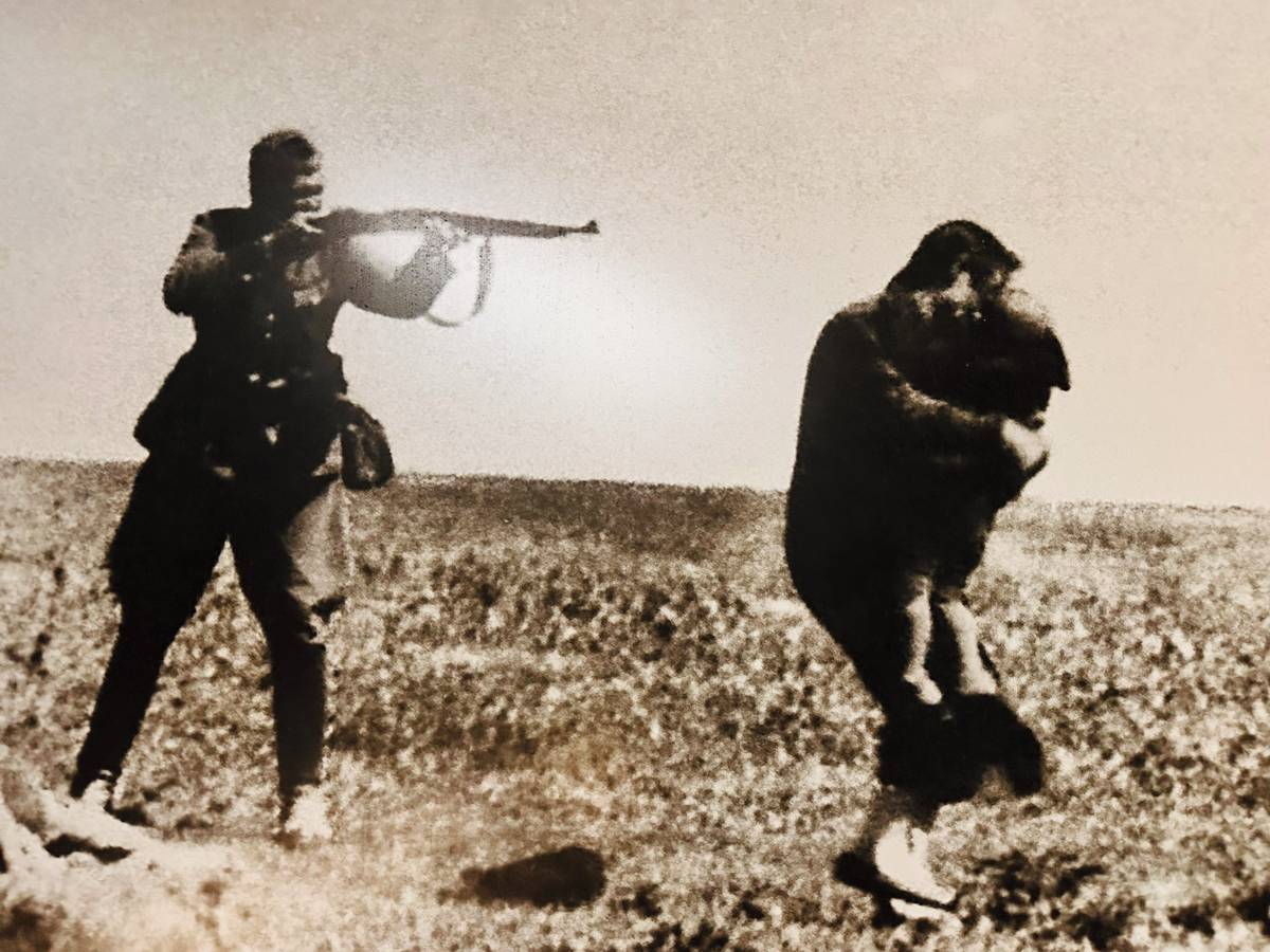 Hrůza války v plném rozsahu. Tuto fotografii německý voják poslal v dopise své manželce. Pln hrdosti z dobře splněného úkolu na ní střílí židovskou rodinu.