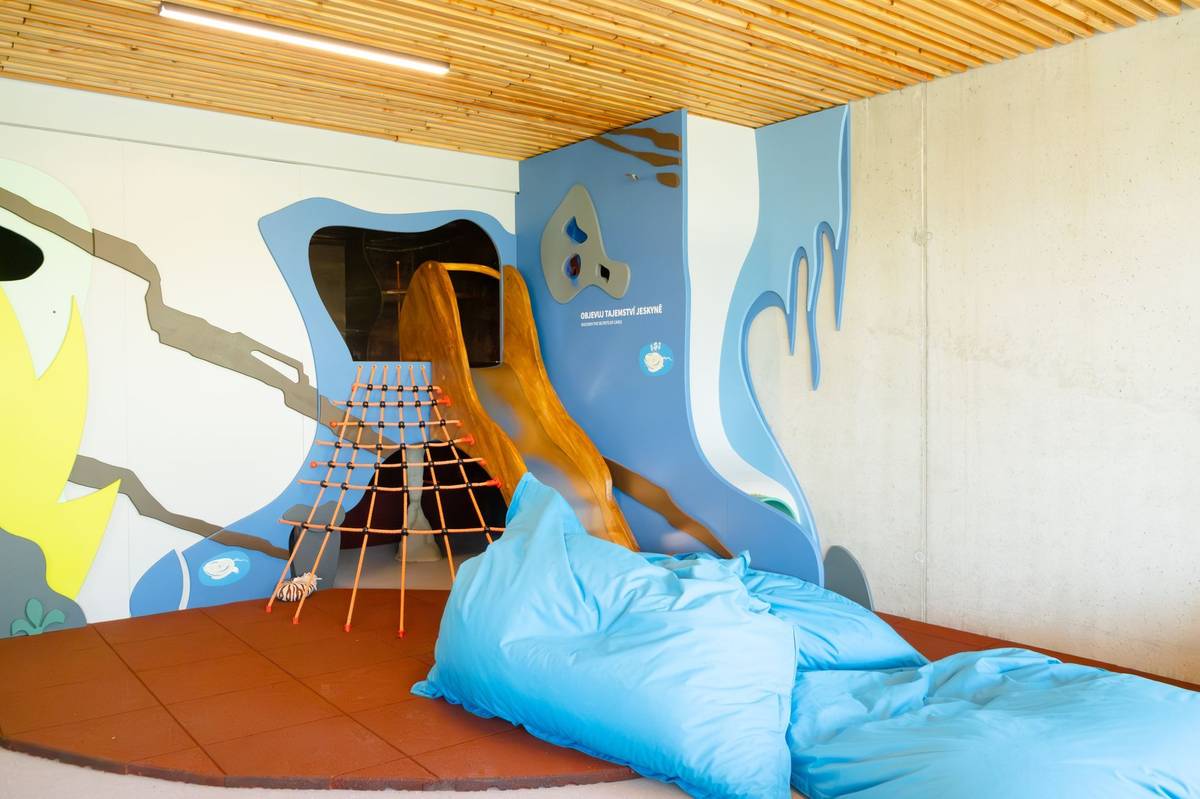 Děti,ale i dospělí si v místnosti vyzkouší, jaký to je pocit, když geologové v jeskyních prolézají plazivkou - úzkou štěrbinou v podzemí.