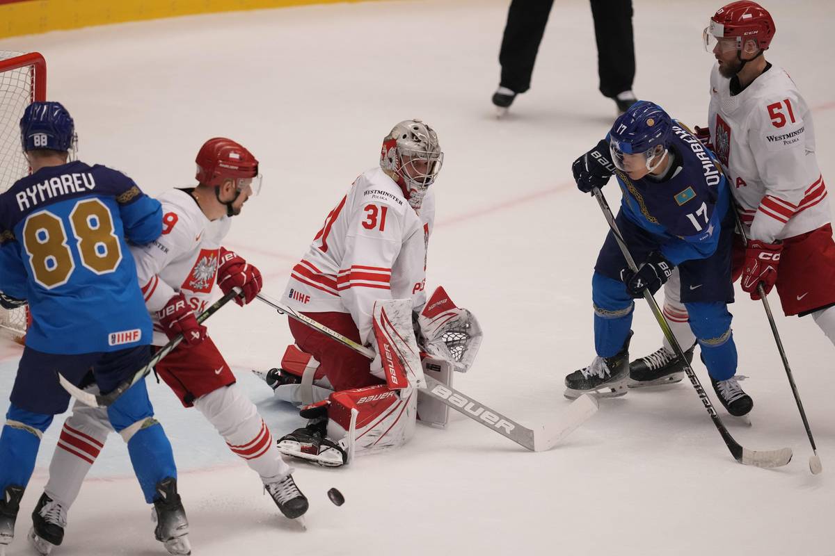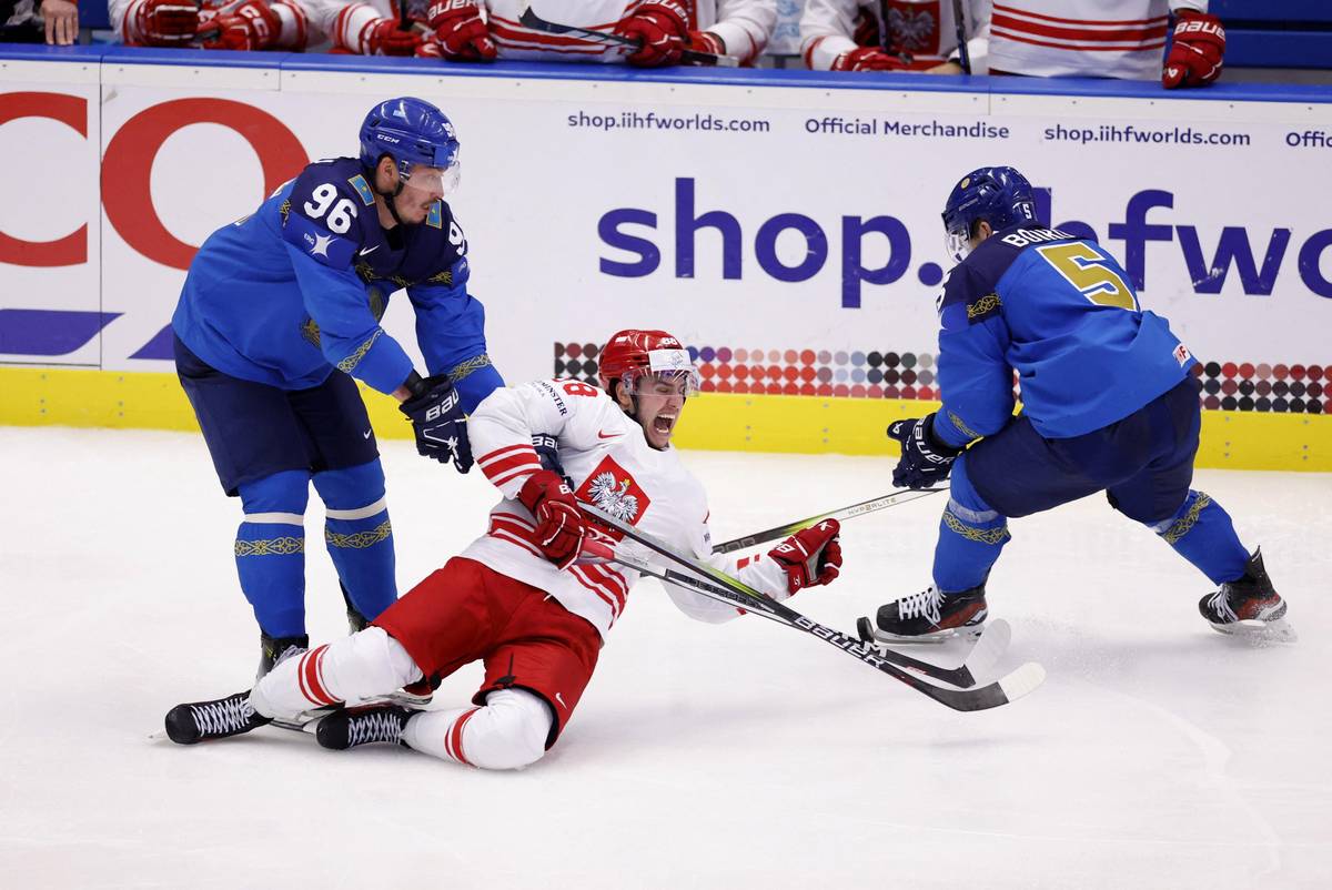 Souboj o puk Poláka Alana Lyszczarczyka s hráči Kazachstánu Alikhanem Asetovem a Olegem Boikovem.