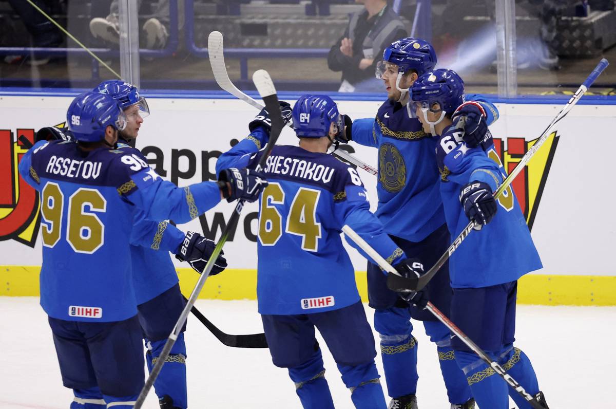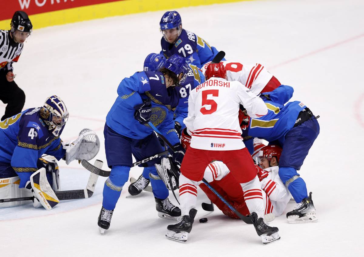Bitka mezi hráči o puk před brankou Kazachstánu.