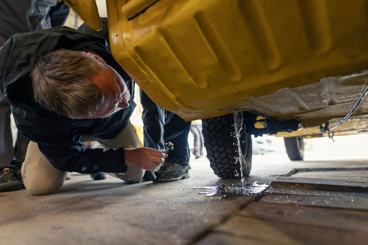 Když se podíváme pod ni, je blok motoru celý mastný a vanu naší lodi na kolečkách pokrývají tmavé skvrny.