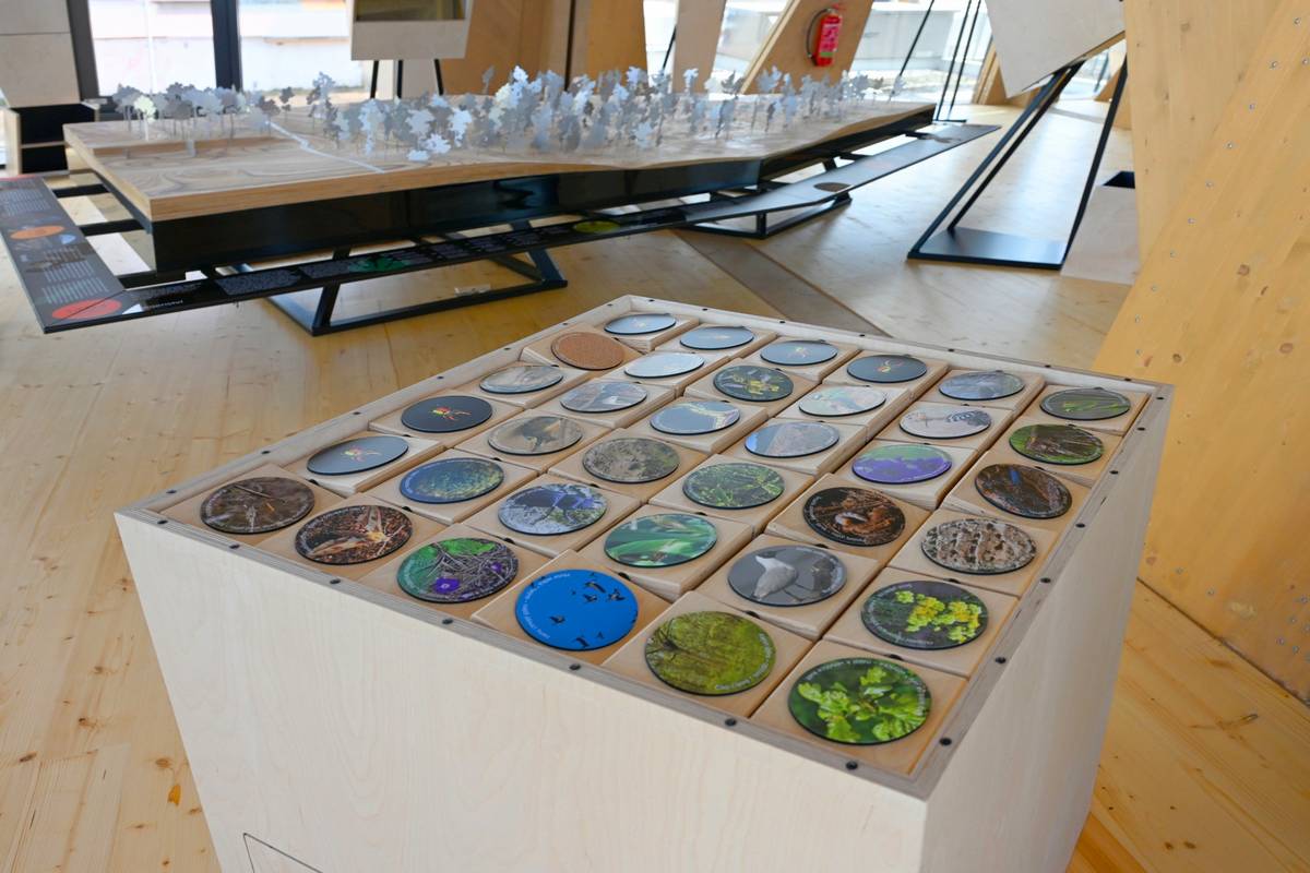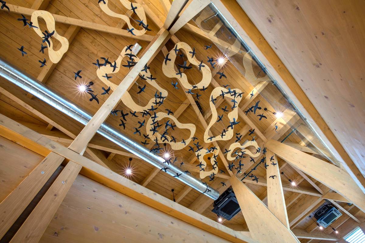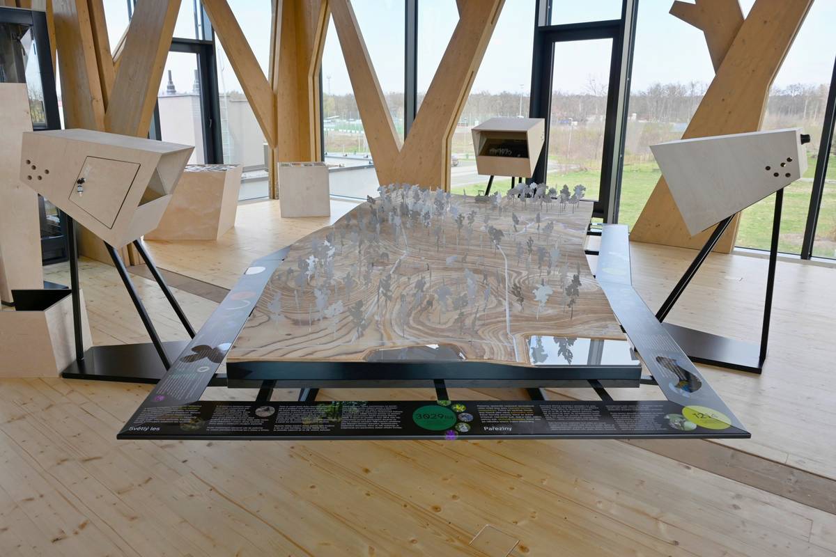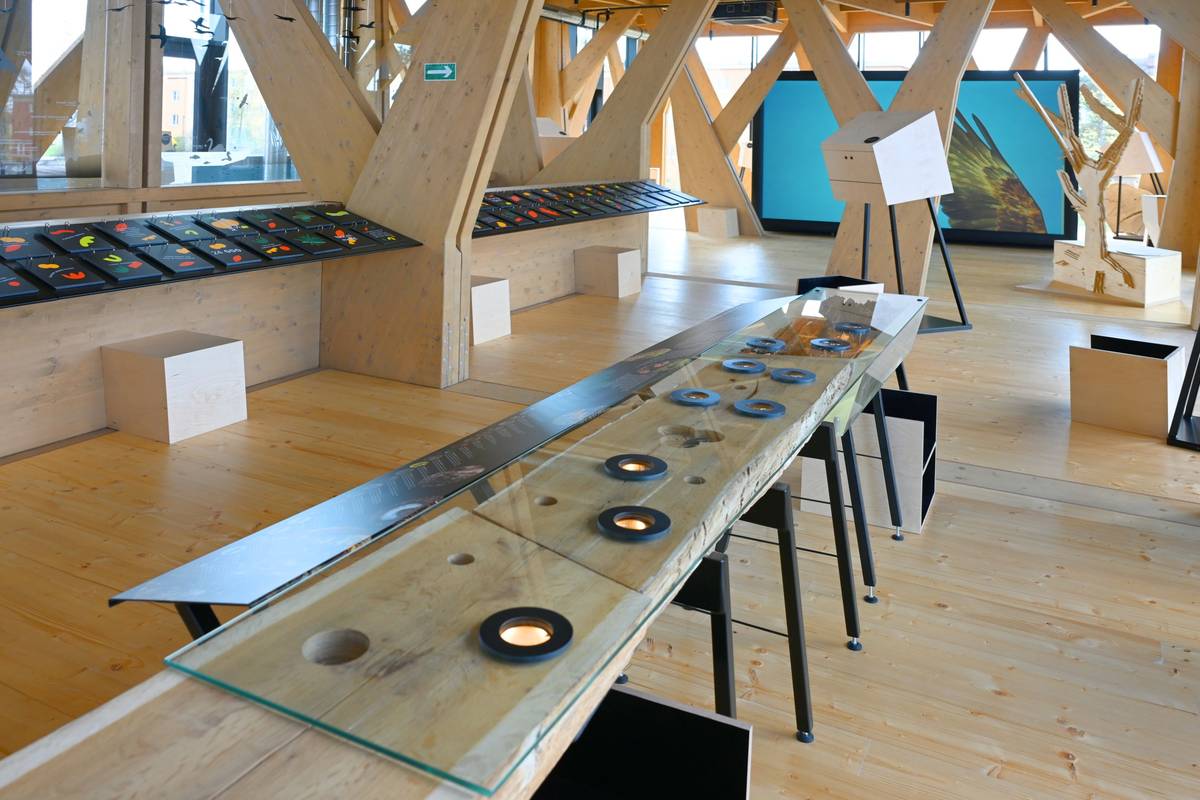Schodiště nabízí průhled k dřevěnému stropu expozice.