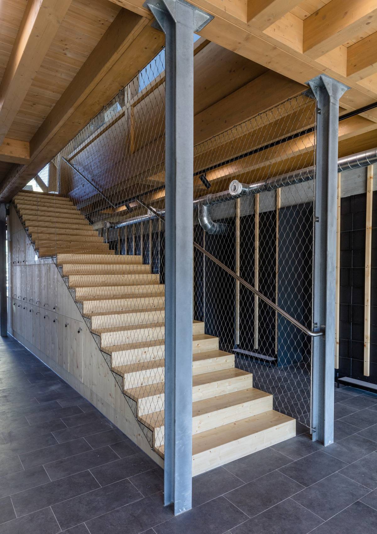 Šatna se skříňkami pro návštěvníky podpírá schodiště.