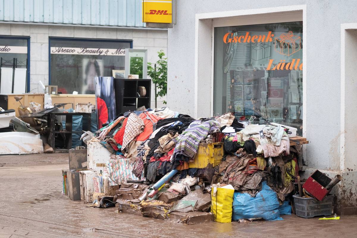 Teď už se v obci nedaleko Stuttgartu začalo uklízet. Všude je bahno, před domy se shromažďují zničené věci. (Rudersberg, 4. června)
