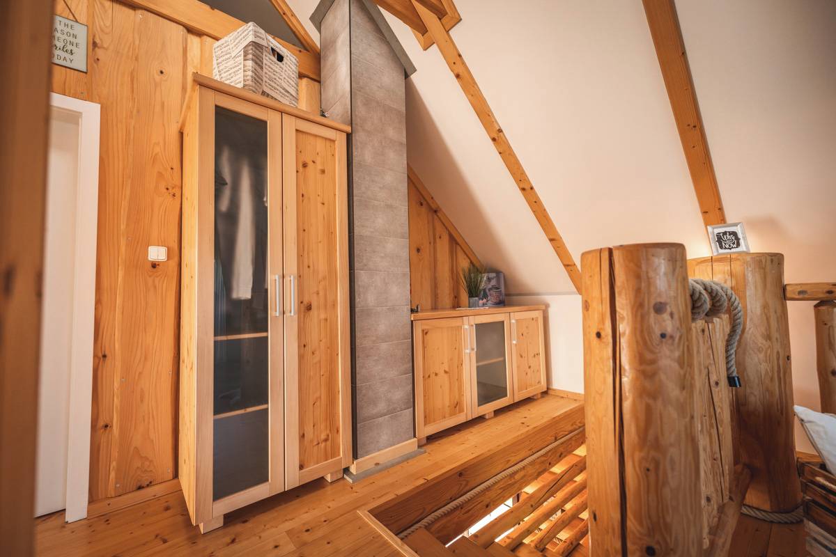 Společnému prostoru dominuje krásné srubové schodiště se zábradlím