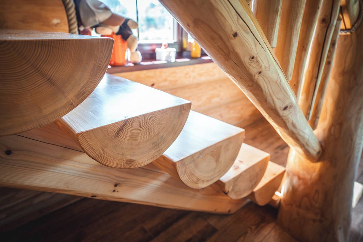 Detail srubového schodiště z půlkuláčů