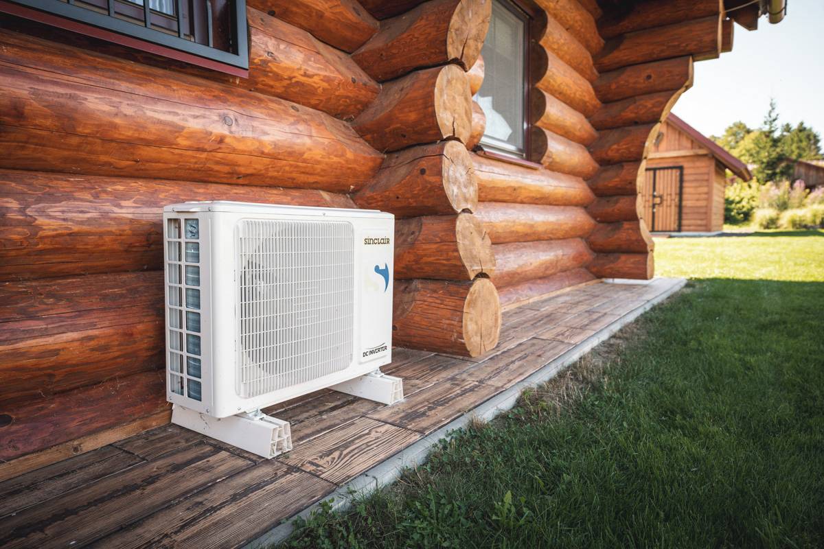Venkovní jednotka tepelného čerpadla vzduch-vzduch působí u srubového domu výrazně