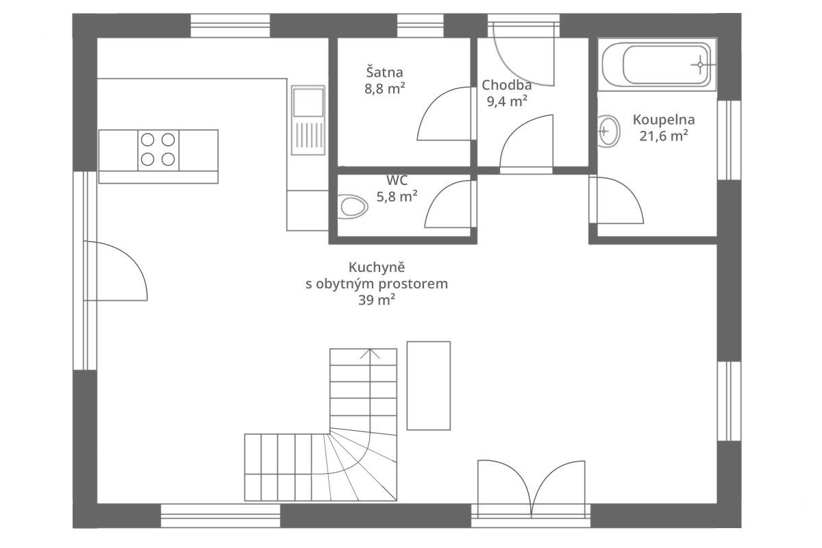 Samostatné WC je nedaleko vstupu do domu, v přízemí je všude dlažba