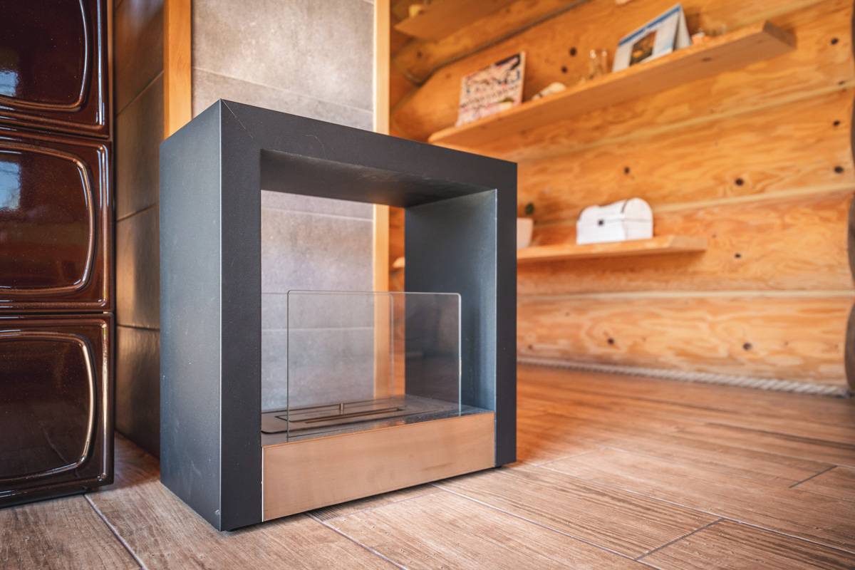 V obývacím pokoji se nachází dvě topidla – kachlová krbová kamna (6 kW) a biokrb (3 kW)