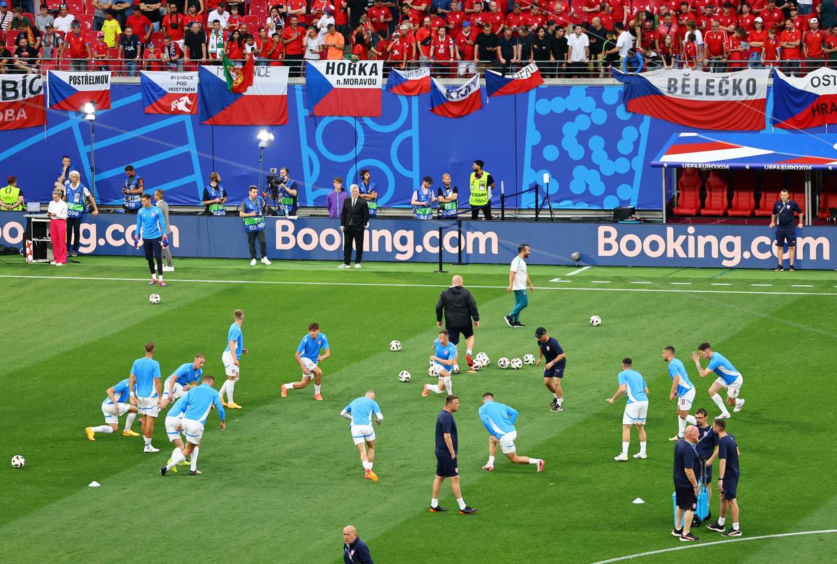 Čeští hráči na rozcvičce před zápasem s Portugalskem na Euru