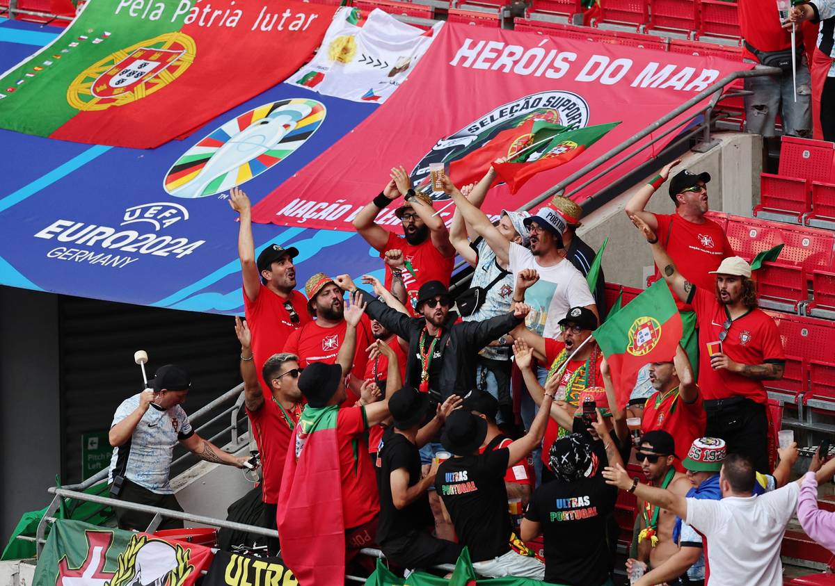 Portugalští fanoušci před zápasem s Českem na stadionu v Lipsku