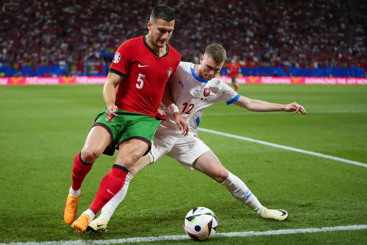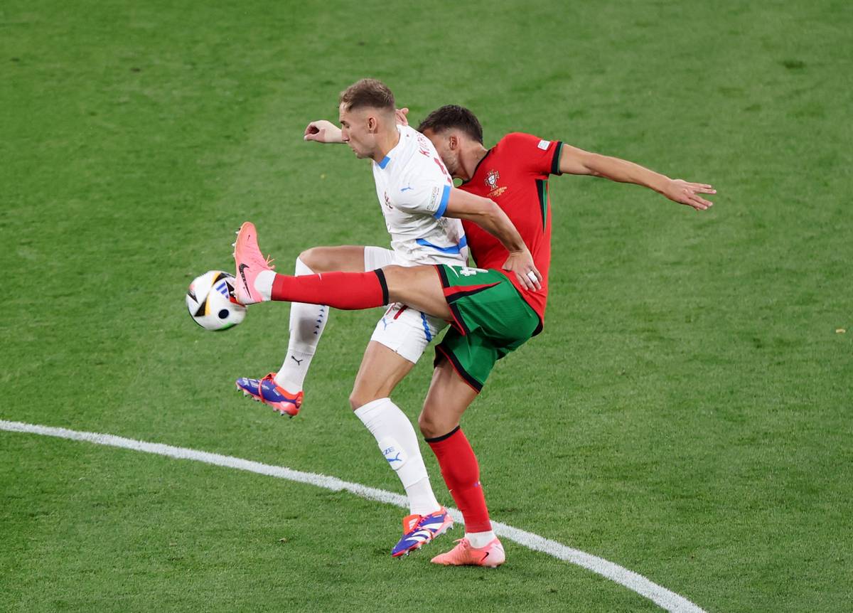 Portugalský Diogo Dalot (vlevo) v souboji s českým Davidem Douděrou ve vzájemném zápase na Euru