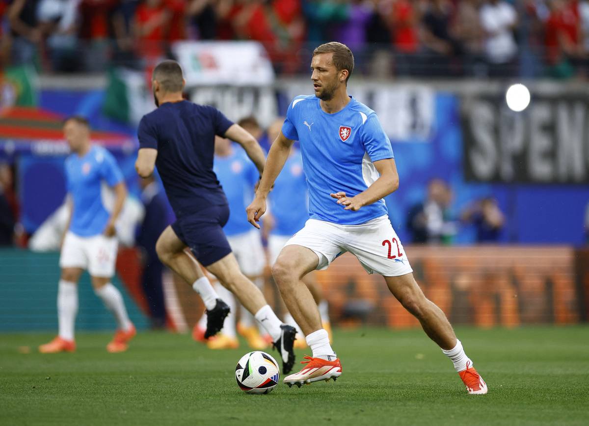 Kapitán Česka Tomáš Souček na rozcvičce před zápasem s Portugalskem na Euru
