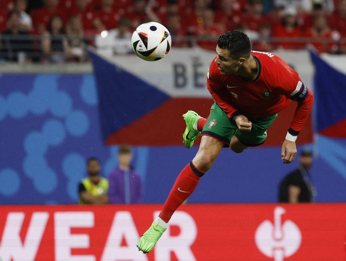 Hlavička Cristiana Ronalda v zápase s Českem