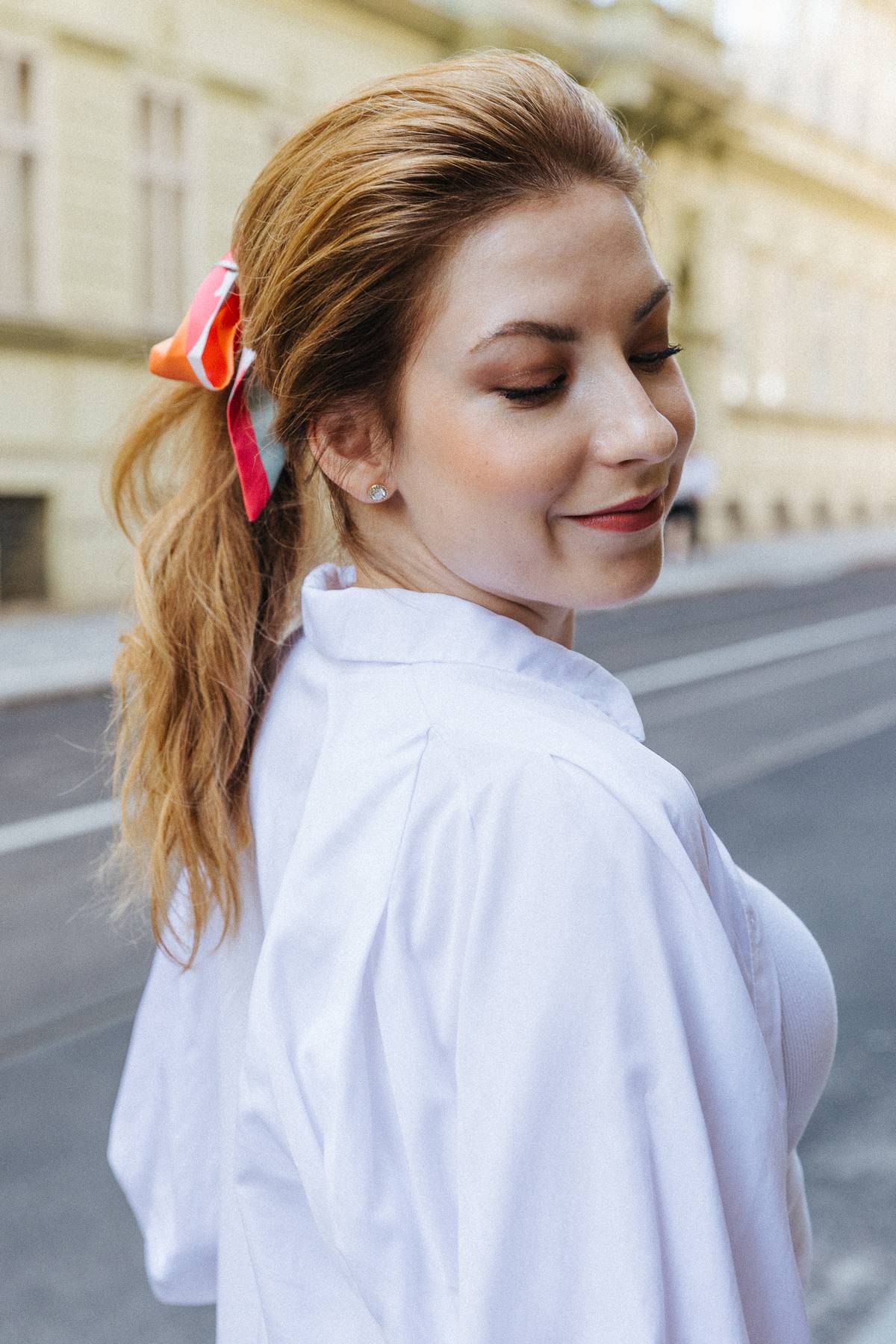 Vrchní vlasy přidejte k prvnímu culíku a spojte druhou gumičkou