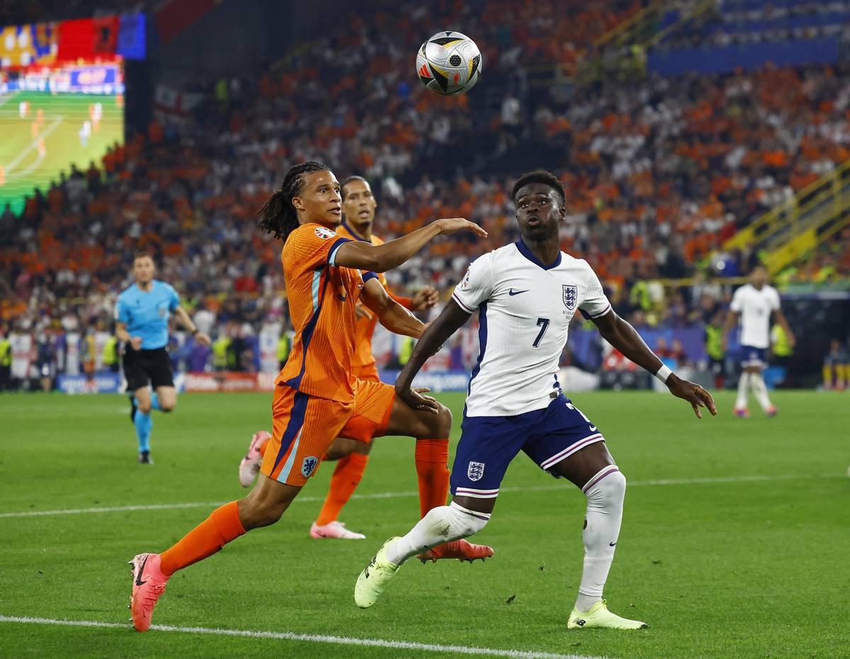 Bek Nathan Aké (v oranžovém) marně stíhá anglického křídelníka Bukaya Saku