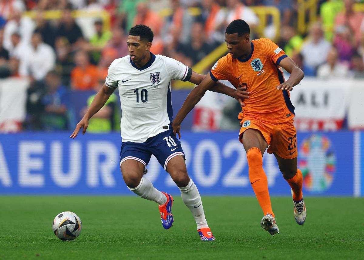 Anglický záložník Jude Bellingham se snažil obejít Denzela Dumfriese